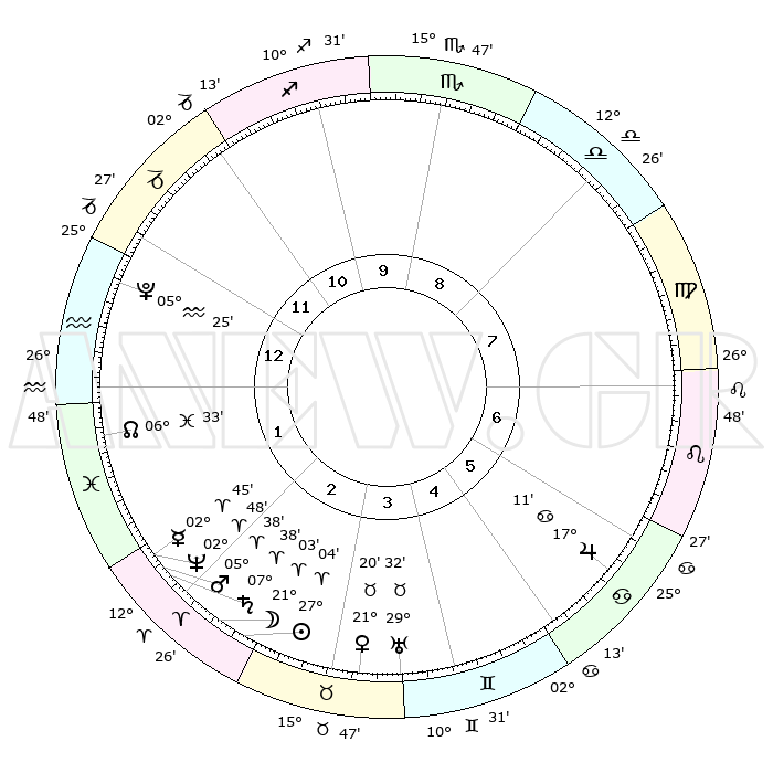 | | ΘΕΣΕΙΣ ΠΛΑΝΗΤΩΝ ΑΣΤΡΟΛΟΓΙΚΟΥ ΧΑΡΤΗ ΤΗΣ ΣΤΙΓΜΗΣ ΑΥΤΗΣ | | | | Πλανήτης | Ζώδιο | Μοίρες | Δεκαήμ. | Σε οίκο | Απόκλιση | | Ακμές των οίκων | | Ηλιος | Κριός | 27°01' | Τρίτο | 3 | 10 N 24 | | 1ος | 01°31' | Υδροχόος | | Σελήνη | Κριός | 20°17' | Τρίτο | 2 | 11 N 07 | | 2ος | 15°51' | Ιχθείς | | Ερμής | Κριός | 02°41' | Πρώτο | 2 | 01 S 21 | | 3ος | 24°03' | Κριός | | Αφροδίτη | Ταύρος | 21°16' | Τρίτο | 3 | 18 N 20 | | 4ος | 22°16' | Ταύρος | | Αρης | Κριός | 05°36' | Πρώτο | 2 | 01 N 20 | | 5ος | 14°55' | Δίδυμοι | | Δίας | Καρκίνος | 17°11' | Δεύτερο | 6 | 22 N 42 | | 6ος | 06°24' | Καρκίνος | | Κρόνος | Κριός | 07°38' | Πρώτο | 2 | 01 N 03 | | 7ος | 01°31' | Λέων | | Ουρανός | Ταύρος | 29°32' | Τρίτο | 4 | 19 N 53 | | 8ος | 15°51' | Παρθένος | | Ποσειδώνας | Κριός | 02°48' | Πρώτο | 2 | 00 S 06 | | 9ος | 24°03' | Ζυγός | | Πλούτωνας | Υδροχόος | 05°25' | Πρώτο | 1 | 22 S 47 | | 10ος | 22°16' | Σκορπιός | | Β. Δεσμός | Ιχθείς | 06°33' | Πρώτο | 1 | 09 S 06 | | 11ος | 14°55' | Τοξότης | | Ωροσκόπος | Υδροχόος | 01°31' | Πρώτο | | | 12ος | 06°24' | Αιγόκερως | | Μεσουράνημα | Σκορπιός | 22°16' | Τρίτο | | | |
