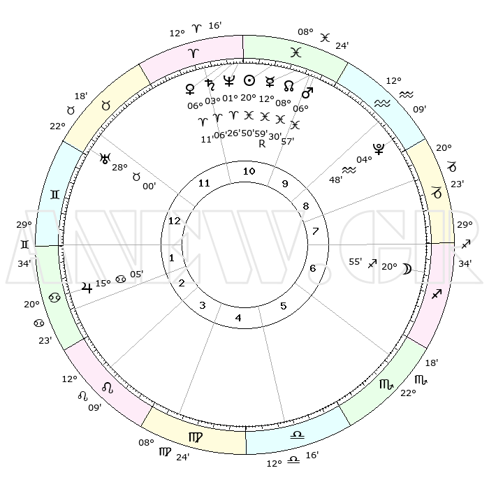 | | ΘΕΣΕΙΣ ΠΛΑΝΗΤΩΝ ΑΣΤΡΟΛΟΓΙΚΟΥ ΧΑΡΤΗ ΤΗΣ ΣΤΙΓΜΗΣ ΑΥΤΗΣ | | | | Πλανήτης | Ζώδιο | Μοίρες | Δεκαήμ. | Σε οίκο | Απόκλιση | | Ακμές των οίκων | | Ηλιος | Ιχθείς | 20°46' | Τρίτο | 11 | 03 S 39 | | 1ος | 07°28' | Δίδυμοι | | Σελήνη | Τοξότης | 20°11' | Τρίτο | 7 | 28 S 14 | | 2ος | 00°53' | Καρκίνος | | Ερμής | Ιχθείς | 13°03'R | Δεύτερο | 10 | 03 S 44 | | 3ος | 22°07' | Καρκίνος | | Αφροδίτη | Κριός | 06°06' | Πρώτο | 11 | 01 N 22 | | 4ος | 15°31' | Λέων | | Αρης | Ιχθείς | 06°54' | Πρώτο | 10 | 09 S 59 | | 5ος | 15°19' | Παρθένος | | Δίας | Καρκίνος | 15°05' | Δεύτερο | 2 | 22 N 56 | | 6ος | 24°47' | Ζυγός | | Κρόνος | Κριός | 03°06' | Πρώτο | 11 | 00 S 43 | | 7ος | 07°28' | Τοξότης | | Ουρανός | Ταύρος | 27°60' | Τρίτο | 12 | 19 N 32 | | 8ος | 00°53' | Αιγόκερως | | Ποσειδώνας | Κριός | 01°26' | Πρώτο | 11 | 00 S 38 | | 9ος | 22°07' | Αιγόκερως | | Πλούτωνας | Υδροχόος | 04°48' | Πρώτο | 9 | 22 S 50 | | 10ος | 15°31' | Υδροχόος | | Β. Δεσμός | Ιχθείς | 08°30' | Πρώτο | 10 | 08 S 23 | | 11ος | 15°19' | Ιχθείς | | Ωροσκόπος | Δίδυμοι | 07°28' | Πρώτο | | | 12ος | 24°47' | Κριός | | Μεσουράνημα | Υδροχόος | 15°31' | Δεύτερο | | | |