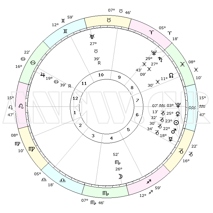 | | ΘΕΣΕΙΣ ΠΛΑΝΗΤΩΝ ΑΣΤΡΟΛΟΓΙΚΟΥ ΧΑΡΤΗ ΤΗΣ ΣΤΙΓΜΗΣ ΑΥΤΗΣ | | | | Πλανήτης | Ζώδιο | Μοίρες | Δεκαήμ. | Σε οίκο | Απόκλιση | | Ακμές των οίκων | | Ηλιος | Αιγόκερως | 23°28' | Τρίτο | 6 | 21 S 24 | | 1ος | 27°49' | Καρκίνος | | Σελήνη | Σκορπιός | 26°08' | Τρίτο | 5 | 24 S 07 | | 2ος | 18°43' | Λέων | | Ερμής | Αιγόκερως | 18°28' | Δεύτερο | 6 | 23 S 51 | | 3ος | 13°28' | Παρθένος | | Αφροδίτη | Αιγόκερως | 25°08' | Τρίτο | 6 | 22 S 01 | | 4ος | 14°14' | Ζυγός | | Αρης | Αιγόκερως | 22°27' | Τρίτο | 6 | 22 S 31 | | 5ος | 20°19' | Σκορπιός | | Δίας | Καρκίνος | 19°40'R | Δεύτερο | 12 | 22 N 16 | | 6ος | 26°23' | Τοξότης | | Κρόνος | Ιχθείς | 27°08' | Τρίτο | 9 | 03 S 10 | | 7ος | 27°49' | Αιγόκερως | | Ουρανός | Ταύρος | 27°39'R | Τρίτο | 11 | 19 N 27 | | 8ος | 18°43' | Υδροχόος | | Ποσειδώνας | Ιχθείς | 29°43' | Τρίτο | 9 | 01 S 20 | | 9ος | 13°29' | Ιχθείς | | Πλούτωνας | Υδροχόος | 03°07' | Πρώτο | 7 | 23 S 08 | | 10ος | 14°14' | Κριός | | Β. Δεσμός | Ιχθείς | 11°30' | Δεύτερο | 8 | 07 S 15 | | 11ος | 20°19' | Ταύρος | | Ωροσκόπος | Καρκίνος | 27°49' | Τρίτο | | | 12ος | 26°23' | Δίδυμοι | | Μεσουράνημα | Κριός | 14°14' | Δεύτερο | | | |