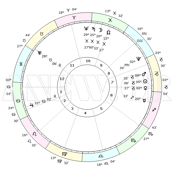 | | ΘΕΣΕΙΣ ΠΛΑΝΗΤΩΝ ΑΣΤΡΟΛΟΓΙΚΟΥ ΧΑΡΤΗ ΤΗΣ ΣΤΙΓΜΗΣ ΑΥΤΗΣ | | | | Πλανήτης | Ζώδιο | Μοίρες | Δεκαήμ. | Σε οίκο | Απόκλιση | | Ακμές των οίκων | | Ηλιος | Αιγόκερως | 05°01' | Πρώτο | 8 | 23 S 20 | | 1ος | 04°59' | Δίδυμοι | | Σελήνη | Ιχθείς | 19°29' | Δεύτερο | 11 | 03 S 30 | | 2ος | 28°50' | Δίδυμοι | | Ερμής | Τοξότης | 20°26' | Τρίτο | 7 | 23 S 01 | | 3ος | 20°07' | Καρκίνος | | Αφροδίτη | Αιγόκερως | 02°21' | Πρώτο | 8 | 23 S 42 | | 4ος | 13°17' | Λέων | | Αρης | Αιγόκερως | 08°32' | Πρώτο | 8 | 24 S 01 | | 5ος | 12°38' | Παρθένος | | Δίας | Καρκίνος | 22°03'R | Τρίτο | 3 | 21 N 51 | | 6ος | 21°48' | Ζυγός | | Κρόνος | Ιχθείς | 25°60' | Τρίτο | 11 | 03 S 41 | | 7ος | 04°59' | Τοξότης | | Ουρανός | Ταύρος | 28°06'R | Τρίτο | 12 | 19 N 32 | | 8ος | 28°50' | Τοξότης | | Ποσειδώνας | Ιχθείς | 29°27' | Τρίτο | 11 | 01 S 27 | | 9ος | 20°07' | Αιγόκερως | | Πλούτωνας | Υδροχόος | 02°34' | Πρώτο | 9 | 23 S 15 | | 10ος | 13°17' | Υδροχόος | | Β. Δεσμός | Ιχθείς | 12°27' | Δεύτερο | 10 | 06 S 53 | | 11ος | 12°38' | Ιχθείς | | Ωροσκόπος | Δίδυμοι | 04°59' | Πρώτο | | | 12ος | 21°48' | Κριός | | Μεσουράνημα | Υδροχόος | 13°17' | Δεύτερο | | | |