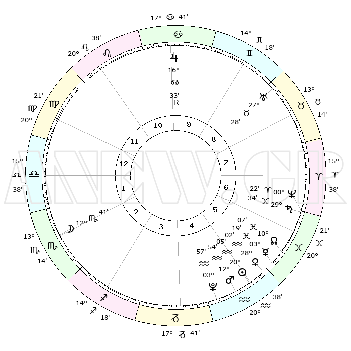 | | ΘΕΣΕΙΣ ΠΛΑΝΗΤΩΝ ΑΣΤΡΟΛΟΓΙΚΟΥ ΧΑΡΤΗ ΤΗΣ ΣΤΙΓΜΗΣ ΑΥΤΗΣ | | | | Πλανήτης | Ζώδιο | Μοίρες | Δεκαήμ. | Σε οίκο | Απόκλιση | | Ακμές των οίκων | | Ηλιος | Υδροχόος | 20°01' | Τρίτο | 5 | 14 S 48 | | 1ος | 23°57' | Παρθένος | | Σελήνη | Σκορπιός | 11°48' | Δεύτερο | 2 | 19 S 48 | | 2ος | 20°04' | Ζυγός | | Ερμής | Ιχθείς | 03°12' | Πρώτο | 6 | 11 S 21 | | 3ος | 20°16' | Σκορπιός | | Αφροδίτη | Υδροχόος | 27°56' | Τρίτο | 6 | 13 S 33 | | 4ος | 23°12' | Τοξότης | | Αρης | Υδροχόος | 12°50' | Δεύτερο | 5 | 17 S 59 | | 5ος | 26°17' | Αιγόκερως | | Δίας | Καρκίνος | 16°33'R | Δεύτερο | 10 | 22 N 43 | | 6ος | 26°57' | Υδροχόος | | Κρόνος | Ιχθείς | 29°33' | Τρίτο | 7 | 02 S 10 | | 7ος | 23°57' | Ιχθείς | | Ουρανός | Ταύρος | 27°28' | Τρίτο | 9 | 19 N 24 | | 8ος | 20°04' | Κριός | | Ποσειδώνας | Κριός | 00°22' | Πρώτο | 7 | 01 S 03 | | 9ος | 20°16' | Ταύρος | | Πλούτωνας | Υδροχόος | 03°57' | Πρώτο | 5 | 22 S 59 | | 10ος | 23°12' | Δίδυμοι | | Β. Δεσμός | Ιχθείς | 10°07' | Δεύτερο | 6 | 07 S 46 | | 11ος | 26°17' | Καρκίνος | | Ωροσκόπος | Παρθένος | 23°57' | Τρίτο | | | 12ος | 26°57' | Λέων | | Μεσουράνημα | Δίδυμοι | 23°12' | Τρίτο | | | |