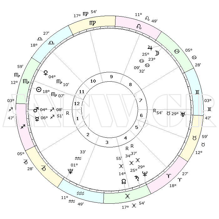 | | ΘΕΣΕΙΣ ΠΛΑΝΗΤΩΝ ΑΣΤΡΟΛΟΓΙΚΟΥ ΧΑΡΤΗ ΤΗΣ ΣΤΙΓΜΗΣ ΑΥΤΗΣ | | | | Πλανήτης | Ζώδιο | Μοίρες | Δεκαήμ. | Σε οίκο | Απόκλιση | | Ακμές των οίκων | | Ηλιος | Σκορπιός | 18°02' | Δεύτερο | 1 | 17 S 12 | | 1ος | 12°59' | Σκορπιός | | Σελήνη | Καρκίνος | 22°32' | Τρίτο | 9 | 25 N 36 | | 2ος | 12°18' | Τοξότης | | Ερμής | Τοξότης | 06°51'R | Πρώτο | 1 | 23 S 42 | | 3ος | 15°32' | Αιγόκερως | | Αφροδίτη | Σκορπιός | 04°05' | Πρώτο | 12 | 11 S 38 | | 4ος | 20°40' | Υδροχόος | | Αρης | Τοξότης | 04°04' | Πρώτο | 1 | 21 S 26 | | 5ος | 23°12' | Ιχθείς | | Δίας | Καρκίνος | 25°09' | Τρίτο | 9 | 21 N 12 | | 6ος | 20°29' | Κριός | | Κρόνος | Ιχθείς | 25°34'R | Τρίτο | 5 | 04 S 00 | | 7ος | 12°59' | Ταύρος | | Ουρανός | Ταύρος | 29°55'R | Τρίτο | 7 | 19 N 55 | | 8ος | 12°18' | Δίδυμοι | | Ποσειδώνας | Ιχθείς | 29°37'R | Τρίτο | 5 | 01 S 24 | | 9ος | 15°32' | Καρκίνος | | Πλούτωνας | Υδροχόος | 01°33' | Πρώτο | 3 | 23 S 29 | | 10ος | 20°40' | Λέων | | Β. Δεσμός | Ιχθείς | 14°55' | Δεύτερο | 4 | 05 S 56 | | 11ος | 23°12' | Παρθένος | | Ωροσκόπος | Σκορπιός | 12°59' | Δεύτερο | | | 12ος | 20°29' | Ζυγός | | Μεσουράνημα | Λέων | 20°40' | Τρίτο | | | |