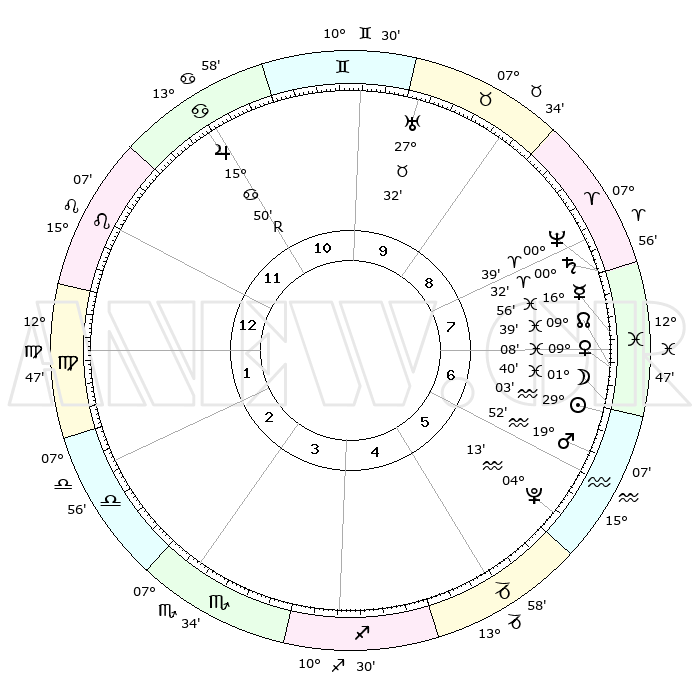 | | ΘΕΣΕΙΣ ΠΛΑΝΗΤΩΝ ΑΣΤΡΟΛΟΓΙΚΟΥ ΧΑΡΤΗ ΤΗΣ ΣΤΙΓΜΗΣ ΑΥΤΗΣ | | | | Πλανήτης | Ζώδιο | Μοίρες | Δεκαήμ. | Σε οίκο | Απόκλιση | | Ακμές των οίκων | | Ηλιος | Υδροχόος | 28°59' | Τρίτο | 7 | 11 S 50 | | 1ος | 22°08' | Λέων | | Σελήνη | Ιχθείς | 00°44' | Πρώτο | 7 | 11 S 55 | | 2ος | 15°10' | Παρθένος | | Ερμής | Ιχθείς | 16°51' | Δεύτερο | 8 | 04 S 35 | | 3ος | 13°03' | Ζυγός | | Αφροδίτη | Ιχθείς | 09°03' | Πρώτο | 7 | 09 S 32 | | 4ος | 15°48' | Σκορπιός | | Αρης | Υδροχόος | 19°48' | Δεύτερο | 6 | 15 S 54 | | 5ος | 20°33' | Τοξότης | | Δίας | Καρκίνος | 15°50'R | Δεύτερο | 11 | 22 N 49 | | 6ος | 23°13' | Αιγόκερως | | Κρόνος | Κριός | 00°31' | Πρώτο | 8 | 01 S 46 | | 7ος | 22°08' | Υδροχόος | | Ουρανός | Ταύρος | 27°32' | Τρίτο | 10 | 19 N 26 | | 8ος | 15°10' | Ιχθείς | | Ποσειδώνας | Κριός | 00°39' | Πρώτο | 8 | 00 S 56 | | 9ος | 13°03' | Κριός | | Πλούτωνας | Υδροχόος | 04°13' | Πρώτο | 6 | 22 S 56 | | 10ος | 15°48' | Ταύρος | | Β. Δεσμός | Ιχθείς | 09°39' | Πρώτο | 7 | 07 S 57 | | 11ος | 20°33' | Δίδυμοι | | Ωροσκόπος | Λέων | 22°08' | Τρίτο | | | 12ος | 23°13' | Καρκίνος | | Μεσουράνημα | Ταύρος | 15°48' | Δεύτερο | | | |