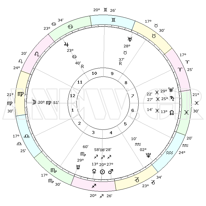 | | ΘΕΣΕΙΣ ΠΛΑΝΗΤΩΝ ΑΣΤΡΟΛΟΓΙΚΟΥ ΧΑΡΤΗ ΤΗΣ ΣΤΙΓΜΗΣ ΑΥΤΗΣ | | | | Πλανήτης | Ζώδιο | Μοίρες | Δεκαήμ. | Σε οίκο | Απόκλιση | | Ακμές των οίκων | | Ηλιος | Τοξότης | 20°08' | Τρίτο | 4 | 23 S 04 | | 1ος | 18°38' | Παρθένος | | Σελήνη | Παρθένος | 20°44' | Τρίτο | 1 | 03 N 03 | | 2ος | 14°19' | Ζυγός | | Ερμής | Σκορπιός | 29°59' | Τρίτο | 3 | 18 S 16 | | 3ος | 14°16' | Σκορπιός | | Αφροδίτη | Τοξότης | 13°57' | Δεύτερο | 3 | 22 S 11 | | 4ος | 17°11' | Τοξότης | | Αρης | Τοξότης | 27°27' | Τρίτο | 4 | 24 S 10 | | 5ος | 20°25' | Αιγόκερως | | Δίας | Καρκίνος | 23°40'R | Τρίτο | 11 | 21 N 33 | | 6ος | 21°18' | Υδροχόος | | Κρόνος | Ιχθείς | 25°27' | Τρίτο | 7 | 03 S 57 | | 7ος | 18°38' | Ιχθείς | | Ουρανός | Ταύρος | 28°37'R | Τρίτο | 9 | 19 N 39 | | 8ος | 14°19' | Κριός | | Ποσειδώνας | Ιχθείς | 29°22' | Τρίτο | 7 | 01 S 29 | | 9ος | 14°16' | Ταύρος | | Πλούτωνας | Υδροχόος | 02°10' | Πρώτο | 5 | 23 S 20 | | 10ος | 17°11' | Δίδυμοι | | Β. Δεσμός | Ιχθείς | 13°14' | Δεύτερο | 6 | 06 S 35 | | 11ος | 20°25' | Καρκίνος | | Ωροσκόπος | Παρθένος | 18°38' | Δεύτερο | | | 12ος | 21°18' | Λέων | | Μεσουράνημα | Δίδυμοι | 17°11' | Δεύτερο | | | |