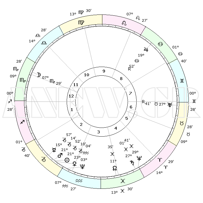 | | ΘΕΣΕΙΣ ΠΛΑΝΗΤΩΝ ΑΣΤΡΟΛΟΓΙΚΟΥ ΧΑΡΤΗ ΤΗΣ ΣΤΙΓΜΗΣ ΑΥΤΗΣ | | | | Πλανήτης | Ζώδιο | Μοίρες | Δεκαήμ. | Σε οίκο | Απόκλιση | | Ακμές των οίκων | | Ηλιος | Αιγόκερως | 21°46' | Τρίτο | 3 | 21 S 40 | | 1ος | 04°17' | Σκορπιός | | Σελήνη | Σκορπιός | 06°24' | Πρώτο | 1 | 17 S 40 | | 2ος | 02°57' | Τοξότης | | Ερμής | Αιγόκερως | 15°48' | Δεύτερο | 3 | 24 S 04 | | 3ος | 05°16' | Αιγόκερως | | Αφροδίτη | Αιγόκερως | 23°03' | Τρίτο | 3 | 22 S 20 | | 4ος | 09°46' | Υδροχόος | | Αρης | Αιγόκερως | 21°10' | Τρίτο | 3 | 22 S 43 | | 5ος | 12°37' | Ιχθείς | | Δίας | Καρκίνος | 19°53'R | Δεύτερο | 9 | 22 N 13 | | 6ος | 10°52' | Κριός | | Κρόνος | Ιχθείς | 27°01' | Τρίτο | 5 | 03 S 14 | | 7ος | 04°17' | Ταύρος | | Ουρανός | Ταύρος | 27°41'R | Τρίτο | 7 | 19 N 27 | | 8ος | 02°57' | Δίδυμοι | | Ποσειδώνας | Ιχθείς | 29°41' | Τρίτο | 5 | 01 S 21 | | 9ος | 05°16' | Καρκίνος | | Πλούτωνας | Υδροχόος | 03°04' | Πρώτο | 3 | 23 S 09 | | 10ος | 09°46' | Λέων | | Β. Δεσμός | Ιχθείς | 11°35' | Δεύτερο | 4 | 07 S 13 | | 11ος | 12°37' | Παρθένος | | Ωροσκόπος | Σκορπιός | 04°17' | Πρώτο | | | 12ος | 10°52' | Ζυγός | | Μεσουράνημα | Λέων | 09°46' | Πρώτο | | | |