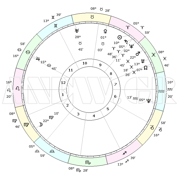 | | ΘΕΣΕΙΣ ΠΛΑΝΗΤΩΝ ΑΣΤΡΟΛΟΓΙΚΟΥ ΧΑΡΤΗ ΤΗΣ ΣΤΙΓΜΗΣ ΑΥΤΗΣ | | | | Πλανήτης | Ζώδιο | Μοίρες | Δεκαήμ. | Σε οίκο | Απόκλιση | | Ακμές των οίκων | | Ηλιος | Κριός | 10°44' | Δεύτερο | 9 | 04 N 15 | | 1ος | 28°60' | Καρκίνος | | Σελήνη | Παρθένος | 21°24' | Τρίτο | 3 | 02 N 21 | | 2ος | 19°58' | Λέων | | Ερμής | Ιχθείς | 13°15' | Δεύτερο | 8 | 07 S 42 | | 3ος | 14°53' | Παρθένος | | Αφροδίτη | Ταύρος | 00°59' | Πρώτο | 10 | 11 N 22 | | 4ος | 15°47' | Ζυγός | | Αρης | Ιχθείς | 22°42' | Τρίτο | 9 | 03 S 51 | | 5ος | 21°51' | Σκορπιός | | Δίας | Καρκίνος | 15°45' | Δεύτερο | 12 | 22 N 52 | | 6ος | 27°43' | Τοξότης | | Κρόνος | Κριός | 05°36' | Πρώτο | 9 | 00 N 16 | | 7ος | 28°60' | Αιγόκερως | | Ουρανός | Ταύρος | 28°44' | Τρίτο | 11 | 19 N 42 | | 8ος | 19°58' | Υδροχόος | | Ποσειδώνας | Κριός | 02°11' | Πρώτο | 9 | 00 S 20 | | 9ος | 14°53' | Ιχθείς | | Πλούτωνας | Υδροχόος | 05°12' | Πρώτο | 7 | 22 S 47 | | 10ος | 15°47' | Κριός | | Β. Δεσμός | Ιχθείς | 07°26' | Πρώτο | 8 | 08 S 47 | | 11ος | 21°51' | Ταύρος | | Ωροσκόπος | Καρκίνος | 28°60' | Τρίτο | | | 12ος | 27°43' | Δίδυμοι | | Μεσουράνημα | Κριός | 15°47' | Δεύτερο | | | |