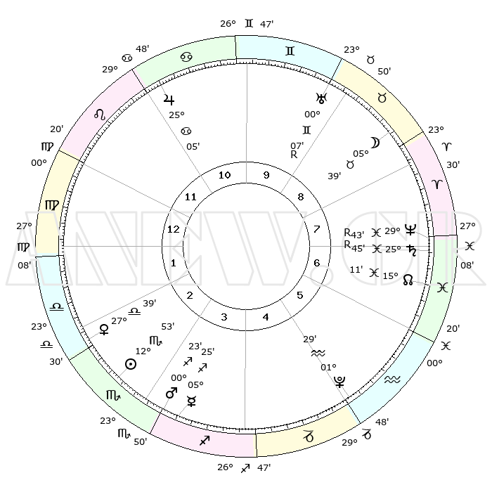 | | ΘΕΣΕΙΣ ΠΛΑΝΗΤΩΝ ΑΣΤΡΟΛΟΓΙΚΟΥ ΧΑΡΤΗ ΤΗΣ ΣΤΙΓΜΗΣ ΑΥΤΗΣ | | | | Πλανήτης | Ζώδιο | Μοίρες | Δεκαήμ. | Σε οίκο | Απόκλιση | | Ακμές των οίκων | | Ηλιος | Σκορπιός | 12°46' | Δεύτερο | 3 | 15 S 40 | | 1ος | 23°47' | Λέων | | Σελήνη | Ταύρος | 03°55' | Πρώτο | 9 | 16 N 19 | | 2ος | 16°59' | Παρθένος | | Ερμής | Τοξότης | 05°21' | Πρώτο | 4 | 23 S 58 | | 3ος | 15°03' | Ζυγός | | Αφροδίτη | Ζυγός | 27°30' | Τρίτο | 3 | 09 S 15 | | 4ος | 17°50' | Σκορπιός | | Αρης | Τοξότης | 00°18' | Πρώτο | 4 | 20 S 38 | | 5ος | 22°28' | Τοξότης | | Δίας | Καρκίνος | 25°05' | Τρίτο | 12 | 21 N 12 | | 6ος | 24°58' | Αιγόκερως | | Κρόνος | Ιχθείς | 25°45'R | Τρίτο | 8 | 03 S 56 | | 7ος | 23°47' | Υδροχόος | | Ουρανός | Δίδυμοι | 00°07'R | Πρώτο | 10 | 19 N 58 | | 8ος | 16°59' | Ιχθείς | | Ποσειδώνας | Ιχθείς | 29°43'R | Τρίτο | 8 | 01 S 22 | | 9ος | 15°03' | Κριός | | Πλούτωνας | Υδροχόος | 01°29' | Πρώτο | 6 | 23 S 30 | | 10ος | 17°50' | Ταύρος | | Β. Δεσμός | Ιχθείς | 15°11' | Δεύτερο | 7 | 05 S 50 | | 11ος | 22°28' | Δίδυμοι | | Ωροσκόπος | Λέων | 23°47' | Τρίτο | | | 12ος | 24°58' | Καρκίνος | | Μεσουράνημα | Ταύρος | 17°50' | Δεύτερο | | | |
