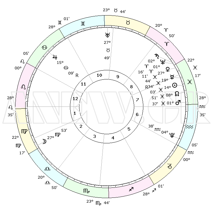 | | ΘΕΣΕΙΣ ΠΛΑΝΗΤΩΝ ΑΣΤΡΟΛΟΓΙΚΟΥ ΧΑΡΤΗ ΤΗΣ ΣΤΙΓΜΗΣ ΑΥΤΗΣ | | | | Πλανήτης | Ζώδιο | Μοίρες | Δεκαήμ. | Σε οίκο | Απόκλιση | | Ακμές των οίκων | | Ηλιος | Ιχθείς | 13°60' | Δεύτερο | 8 | 06 S 18 | | 1ος | 13°54' | Λέων | | Σελήνη | Παρθένος | 27°14' | Τρίτο | 2 | 00 S 25 | | 2ος | 06°05' | Παρθένος | | Ερμής | Ιχθείς | 19°37'R | Δεύτερο | 8 | 00 S 45 | | 3ος | 02°59' | Ζυγός | | Αφροδίτη | Ιχθείς | 27°41' | Τρίτο | 8 | 02 S 07 | | 4ος | 05°20' | Σκορπιός | | Αρης | Ιχθείς | 01°34' | Πρώτο | 7 | 11 S 56 | | 5ος | 10°42' | Τοξότης | | Δίας | Καρκίνος | 15°09'R | Δεύτερο | 12 | 22 N 55 | | 6ος | 14°19' | Αιγόκερως | | Κρόνος | Κριός | 02°16' | Πρώτο | 8 | 01 S 03 | | 7ος | 13°54' | Υδροχόος | | Ουρανός | Ταύρος | 27°49' | Τρίτο | 10 | 19 N 30 | | 8ος | 06°05' | Ιχθείς | | Ποσειδώνας | Κριός | 01°11' | Πρώτο | 8 | 00 S 44 | | 9ος | 02°59' | Κριός | | Πλούτωνας | Υδροχόος | 04°38' | Πρώτο | 6 | 22 S 52 | | 10ος | 05°20' | Ταύρος | | Β. Δεσμός | Ιχθείς | 08°51' | Πρώτο | 8 | 08 S 15 | | 11ος | 10°42' | Δίδυμοι | | Ωροσκόπος | Λέων | 13°54' | Δεύτερο | | | 12ος | 14°19' | Καρκίνος | | Μεσουράνημα | Ταύρος | 05°20' | Πρώτο | | | |