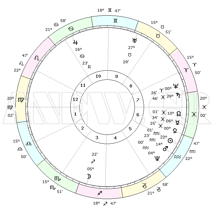 | | ΘΕΣΕΙΣ ΠΛΑΝΗΤΩΝ ΑΣΤΡΟΛΟΓΙΚΟΥ ΧΑΡΤΗ ΤΗΣ ΣΤΙΓΜΗΣ ΑΥΤΗΣ | | | | Πλανήτης | Ζώδιο | Μοίρες | Δεκαήμ. | Σε οίκο | Απόκλιση | | Ακμές των οίκων | | Ηλιος | Υδροχόος | 21°58' | Τρίτο | 6 | 14 S 11 | | 1ος | 02°32' | Παρθένος | | Σελήνη | Τοξότης | 04°39' | Πρώτο | 4 | 26 S 13 | | 2ος | 26°39' | Παρθένος | | Ερμής | Ιχθείς | 06°28' | Πρώτο | 7 | 09 S 52 | | 3ος | 25°32' | Ζυγός | | Αφροδίτη | Ιχθείς | 00°21' | Πρώτο | 6 | 12 S 43 | | 4ος | 28°29' | Σκορπιός | | Αρης | Υδροχόος | 14°21' | Δεύτερο | 6 | 17 S 33 | | 5ος | 02°30' | Αιγόκερως | | Δίας | Καρκίνος | 16°23'R | Δεύτερο | 11 | 22 N 45 | | 6ος | 04°16' | Υδροχόος | | Κρόνος | Ιχθείς | 29°45' | Τρίτο | 8 | 02 S 05 | | 7ος | 02°32' | Ιχθείς | | Ουρανός | Ταύρος | 27°29' | Τρίτο | 9 | 19 N 25 | | 8ος | 26°39' | Ιχθείς | | Ποσειδώνας | Κριός | 00°26' | Πρώτο | 8 | 01 S 02 | | 9ος | 25°32' | Κριός | | Πλούτωνας | Υδροχόος | 04°00' | Πρώτο | 5 | 22 S 58 | | 10ος | 28°29' | Ταύρος | | Β. Δεσμός | Ιχθείς | 10°01' | Δεύτερο | 7 | 07 S 49 | | 11ος | 02°30' | Καρκίνος | | Ωροσκόπος | Παρθένος | 02°32' | Πρώτο | | | 12ος | 04°16' | Λέων | | Μεσουράνημα | Ταύρος | 28°29' | Τρίτο | | | |