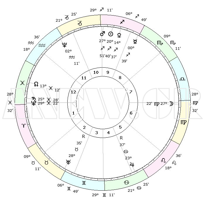 | | ΘΕΣΕΙΣ ΠΛΑΝΗΤΩΝ ΑΣΤΡΟΛΟΓΙΚΟΥ ΧΑΡΤΗ ΤΗΣ ΣΤΙΓΜΗΣ ΑΥΤΗΣ | | | | Πλανήτης | Ζώδιο | Μοίρες | Δεκαήμ. | Σε οίκο | Απόκλιση | | Ακμές των οίκων | | Ηλιος | Τοξότης | 20°35' | Τρίτο | 10 | 23 S 06 | | 1ος | 14°42' | Υδροχόος | | Σελήνη | Παρθένος | 26°23' | Τρίτο | 7 | 00 N 22 | | 2ος | 00°23' | Κριός | | Ερμής | Τοξότης | 00°33' | Πρώτο | 9 | 18 S 27 | | 3ος | 06°10' | Ταύρος | | Αφροδίτη | Τοξότης | 14°31' | Δεύτερο | 10 | 22 S 16 | | 4ος | 02°21' | Δίδυμοι | | Αρης | Τοξότης | 27°48' | Τρίτο | 11 | 24 S 10 | | 5ος | 24°20' | Δίδυμοι | | Δίας | Καρκίνος | 23°37'R | Τρίτο | 6 | 21 N 33 | | 6ος | 16°33' | Καρκίνος | | Κρόνος | Ιχθείς | 25°28' | Τρίτο | 1 | 03 S 56 | | 7ος | 14°42' | Λέων | | Ουρανός | Ταύρος | 28°36'R | Τρίτο | 3 | 19 N 39 | | 8ος | 00°23' | Ζυγός | | Ποσειδώνας | Ιχθείς | 29°22' | Τρίτο | 1 | 01 S 29 | | 9ος | 06°10' | Σκορπιός | | Πλούτωνας | Υδροχόος | 02°10' | Πρώτο | 12 | 23 S 20 | | 10ος | 02°21' | Τοξότης | | Β. Δεσμός | Ιχθείς | 13°12' | Δεύτερο | 1 | 06 S 36 | | 11ος | 24°20' | Τοξότης | | Ωροσκόπος | Υδροχόος | 14°42' | Δεύτερο | | | 12ος | 16°33' | Αιγόκερως | | Μεσουράνημα | Τοξότης | 02°21' | Πρώτο | | | |