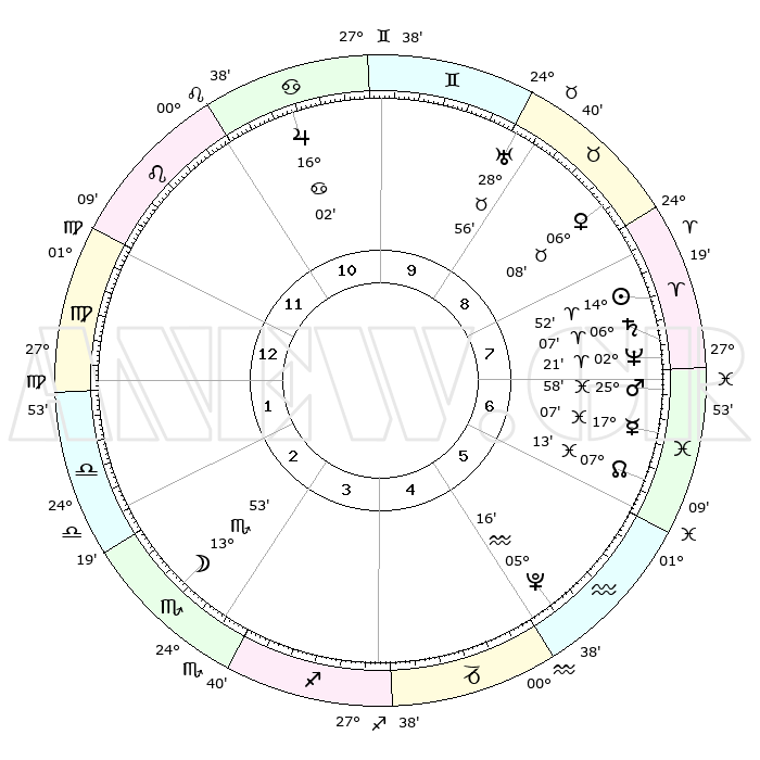 | | ΘΕΣΕΙΣ ΠΛΑΝΗΤΩΝ ΑΣΤΡΟΛΟΓΙΚΟΥ ΧΑΡΤΗ ΤΗΣ ΣΤΙΓΜΗΣ ΑΥΤΗΣ | | | | Πλανήτης | Ζώδιο | Μοίρες | Δεκαήμ. | Σε οίκο | Απόκλιση | | Ακμές των οίκων | | Ηλιος | Κριός | 14°48' | Δεύτερο | 8 | 05 N 50 | | 1ος | 05°14' | Παρθένος | | Σελήνη | Σκορπιός | 12°56' | Δεύτερο | 3 | 20 S 10 | | 2ος | 29°38' | Παρθένος | | Ερμής | Ιχθείς | 17°02' | Δεύτερο | 7 | 06 S 47 | | 3ος | 28°45' | Ζυγός | | Αφροδίτη | Ταύρος | 06°02' | Πρώτο | 9 | 13 N 15 | | 4ος | 01°42' | Τοξότης | | Αρης | Ιχθείς | 25°55' | Τρίτο | 7 | 02 S 34 | | 5ος | 05°33' | Αιγόκερως | | Δίας | Καρκίνος | 16°02' | Δεύτερο | 11 | 22 N 50 | | 6ος | 07°08' | Υδροχόος | | Κρόνος | Κριός | 06°06' | Πρώτο | 8 | 00 N 28 | | 7ος | 05°14' | Ιχθείς | | Ουρανός | Ταύρος | 28°55' | Τρίτο | 9 | 19 N 45 | | 8ος | 29°38' | Ιχθείς | | Ποσειδώνας | Κριός | 02°21' | Πρώτο | 8 | 00 S 16 | | 9ος | 28°45' | Κριός | | Πλούτωνας | Υδροχόος | 05°16' | Πρώτο | 5 | 22 S 47 | | 10ος | 01°42' | Δίδυμοι | | Β. Δεσμός | Ιχθείς | 07°13' | Πρώτο | 7 | 08 S 52 | | 11ος | 05°33' | Καρκίνος | | Ωροσκόπος | Παρθένος | 05°14' | Πρώτο | | | 12ος | 07°08' | Λέων | | Μεσουράνημα | Δίδυμοι | 01°42' | Πρώτο | | | |