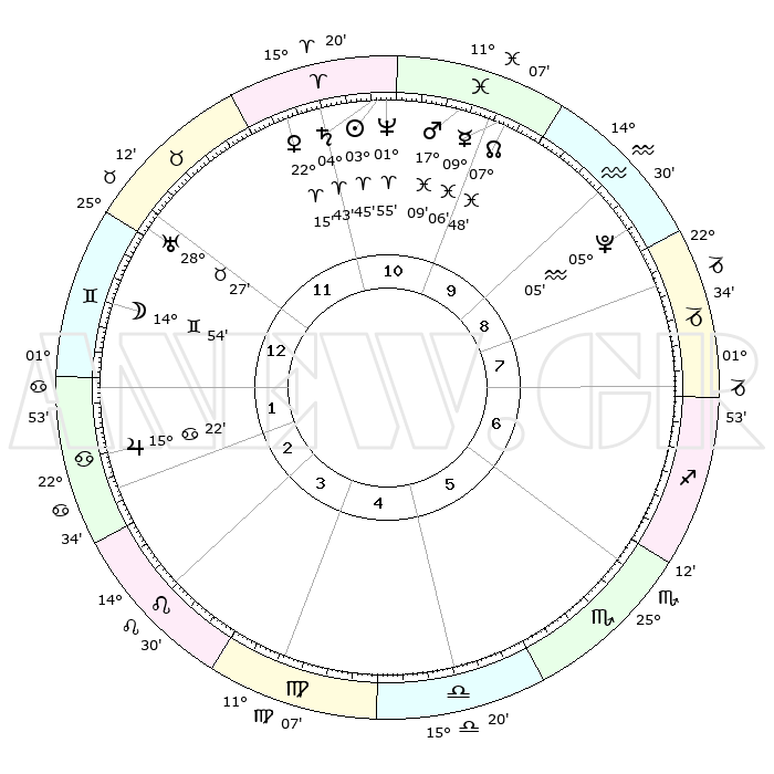 | | ΘΕΣΕΙΣ ΠΛΑΝΗΤΩΝ ΑΣΤΡΟΛΟΓΙΚΟΥ ΧΑΡΤΗ ΤΗΣ ΣΤΙΓΜΗΣ ΑΥΤΗΣ | | | | Πλανήτης | Ζώδιο | Μοίρες | Δεκαήμ. | Σε οίκο | Απόκλιση | | Ακμές των οίκων | | Ηλιος | Κριός | 03°40' | Πρώτο | 11 | 01 N 28 | | 1ος | 06°07' | Δίδυμοι | | Σελήνη | Δίδυμοι | 13°52' | Δεύτερο | 1 | 27 N 38 | | 2ος | 29°46' | Δίδυμοι | | Ερμής | Ιχθείς | 09°04' | Πρώτο | 10 | 08 S 01 | | 3ος | 21°01' | Καρκίνος | | Αφροδίτη | Κριός | 22°10' | Τρίτο | 11 | 07 N 56 | | 4ος | 14°17' | Λέων | | Αρης | Ιχθείς | 17°06' | Δεύτερο | 11 | 06 S 05 | | 5ος | 13°50' | Παρθένος | | Δίας | Καρκίνος | 15°22' | Δεύτερο | 2 | 22 N 55 | | 6ος | 23°09' | Ζυγός | | Κρόνος | Κριός | 04°42' | Πρώτο | 11 | 00 S 05 | | 7ος | 06°07' | Τοξότης | | Ουρανός | Ταύρος | 28°27' | Τρίτο | 12 | 19 N 38 | | 8ος | 29°46' | Τοξότης | | Ποσειδώνας | Κριός | 01°55' | Πρώτο | 11 | 00 S 26 | | 9ος | 21°01' | Αιγόκερως | | Πλούτωνας | Υδροχόος | 05°05' | Πρώτο | 9 | 22 S 48 | | 10ος | 14°17' | Υδροχόος | | Β. Δεσμός | Ιχθείς | 07°49' | Πρώτο | 10 | 08 S 38 | | 11ος | 13°50' | Ιχθείς | | Ωροσκόπος | Δίδυμοι | 06°07' | Πρώτο | | | 12ος | 23°09' | Κριός | | Μεσουράνημα | Υδροχόος | 14°17' | Δεύτερο | | | |