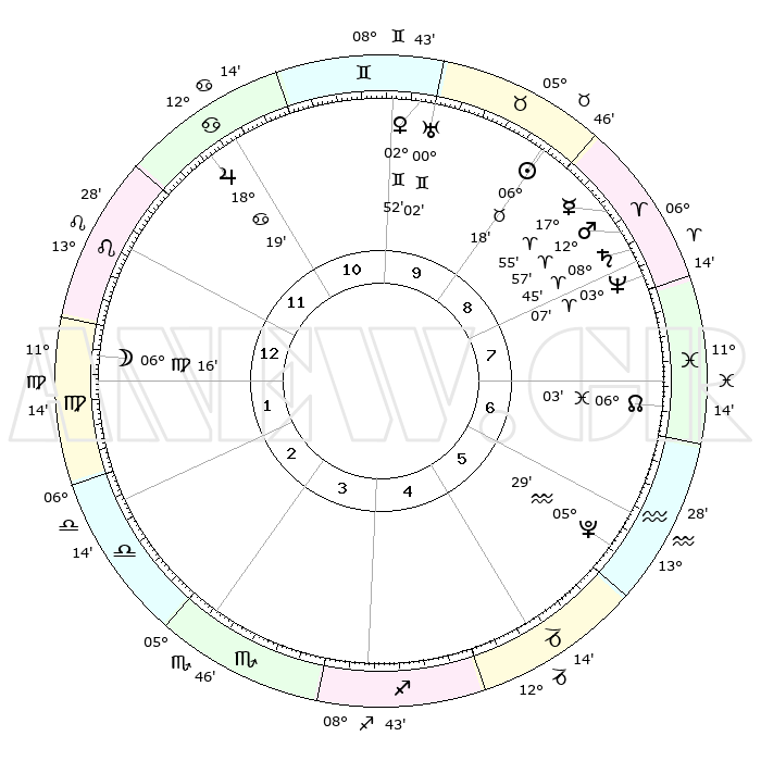 | | ΘΕΣΕΙΣ ΠΛΑΝΗΤΩΝ ΑΣΤΡΟΛΟΓΙΚΟΥ ΧΑΡΤΗ ΤΗΣ ΣΤΙΓΜΗΣ ΑΥΤΗΣ | | | | Πλανήτης | Ζώδιο | Μοίρες | Δεκαήμ. | Σε οίκο | Απόκλιση | | Ακμές των οίκων | | Ηλιος | Ταύρος | 06°15' | Πρώτο | 9 | 13 N 36 | | 1ος | 25°02' | Λέων | | Σελήνη | Παρθένος | 05°33' | Πρώτο | 1 | 09 N 37 | | 2ος | 18°22' | Παρθένος | | Ερμής | Κριός | 17°50' | Δεύτερο | 9 | 04 N 50 | | 3ος | 16°33' | Ζυγός | | Αφροδίτη | Δίδυμοι | 02°48' | Πρώτο | 10 | 21 N 24 | | 4ος | 19°23' | Σκορπιός | | Αρης | Κριός | 12°54' | Δεύτερο | 8 | 04 N 15 | | 5ος | 23°56' | Τοξότης | | Δίας | Καρκίνος | 18°18' | Δεύτερο | 11 | 22 N 34 | | 6ος | 26°18' | Αιγόκερως | | Κρόνος | Κριός | 08°45' | Πρώτο | 8 | 01 N 29 | | 7ος | 25°02' | Υδροχόος | | Ουρανός | Δίδυμοι | 00°02' | Πρώτο | 10 | 19 N 59 | | 8ος | 18°22' | Ιχθείς | | Ποσειδώνας | Κριός | 03°07' | Πρώτο | 8 | 00 N 02 | | 9ος | 16°33' | Κριός | | Πλούτωνας | Υδροχόος | 05°29' | Πρώτο | 6 | 22 S 48 | | 10ος | 19°23' | Ταύρος | | Β. Δεσμός | Ιχθείς | 06°03' | Πρώτο | 7 | 09 S 17 | | 11ος | 23°55' | Δίδυμοι | | Ωροσκόπος | Λέων | 25°02' | Τρίτο | | | 12ος | 26°18' | Καρκίνος | | Μεσουράνημα | Ταύρος | 19°23' | Δεύτερο | | | |