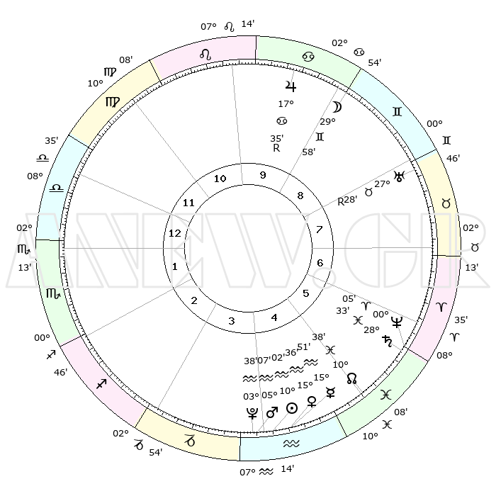 | | ΘΕΣΕΙΣ ΠΛΑΝΗΤΩΝ ΑΣΤΡΟΛΟΓΙΚΟΥ ΧΑΡΤΗ ΤΗΣ ΣΤΙΓΜΗΣ ΑΥΤΗΣ | | | | Πλανήτης | Ζώδιο | Μοίρες | Δεκαήμ. | Σε οίκο | Απόκλιση | | Ακμές των οίκων | | Ηλιος | Υδροχόος | 09°58' | Πρώτο | 4 | 17 S 45 | | 1ος | 15°10' | Ζυγός | | Σελήνη | Δίδυμοι | 29°07' | Τρίτο | 9 | 28 N 20 | | 2ος | 12°44' | Σκορπιός | | Ερμής | Υδροχόος | 15°45' | Δεύτερο | 4 | 18 S 01 | | 3ος | 13°47' | Τοξότης | | Αφροδίτη | Υδροχόος | 15°31' | Δεύτερο | 4 | 17 S 27 | | 4ος | 17°09' | Αιγόκερως | | Αρης | Υδροχόος | 05°05' | Πρώτο | 4 | 20 S 00 | | 5ος | 20°05' | Υδροχόος | | Δίας | Καρκίνος | 17°36'R | Δεύτερο | 10 | 22 N 34 | | 6ος | 19°50' | Ιχθείς | | Κρόνος | Ιχθείς | 28°33' | Τρίτο | 6 | 02 S 35 | | 7ος | 15°10' | Κριός | | Ουρανός | Ταύρος | 27°28'R | Τρίτο | 8 | 19 N 24 | | 8ος | 12°44' | Ταύρος | | Ποσειδώνας | Κριός | 00°05' | Πρώτο | 6 | 01 S 10 | | 9ος | 13°47' | Δίδυμοι | | Πλούτωνας | Υδροχόος | 03°38' | Πρώτο | 4 | 23 S 02 | | 10ος | 17°09' | Καρκίνος | | Β. Δεσμός | Ιχθείς | 10°38' | Δεύτερο | 5 | 07 S 35 | | 11ος | 20°05' | Λέων | | Ωροσκόπος | Ζυγός | 15°10' | Δεύτερο | | | 12ος | 19°50' | Παρθένος | | Μεσουράνημα | Καρκίνος | 17°09' | Δεύτερο | | | |