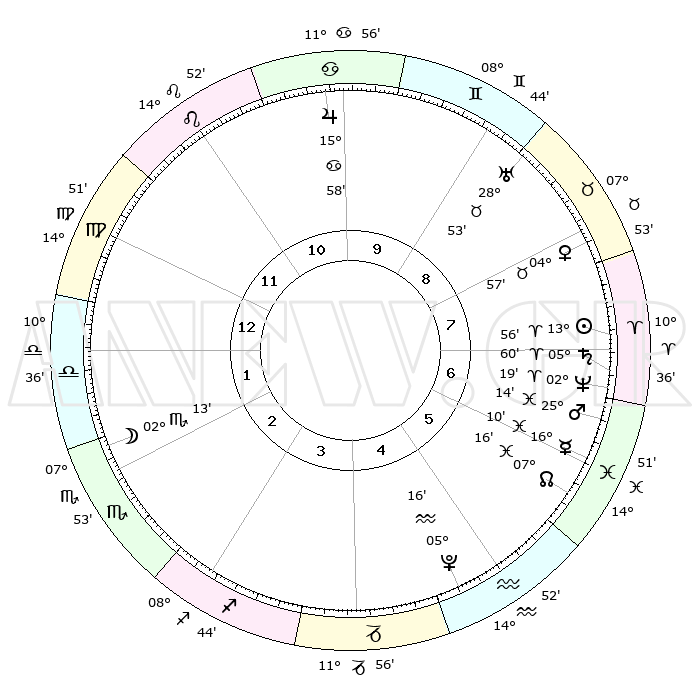 | | ΘΕΣΕΙΣ ΠΛΑΝΗΤΩΝ ΑΣΤΡΟΛΟΓΙΚΟΥ ΧΑΡΤΗ ΤΗΣ ΣΤΙΓΜΗΣ ΑΥΤΗΣ | | | | Πλανήτης | Ζώδιο | Μοίρες | Δεκαήμ. | Σε οίκο | Απόκλιση | | Ακμές των οίκων | | Ηλιος | Κριός | 13°52' | Δεύτερο | 7 | 05 N 28 | | 1ος | 19°31' | Παρθένος | | Σελήνη | Σκορπιός | 01°20' | Πρώτο | 2 | 15 S 48 | | 2ος | 15°16' | Ζυγός | | Ερμής | Ιχθείς | 16°05' | Δεύτερο | 6 | 07 S 02 | | 3ος | 15°15' | Σκορπιός | | Αφροδίτη | Ταύρος | 04°52' | Πρώτο | 8 | 12 N 50 | | 4ος | 18°11' | Τοξότης | | Αρης | Ιχθείς | 25°10' | Τρίτο | 7 | 02 S 52 | | 5ος | 21°23' | Αιγόκερως | | Δίας | Καρκίνος | 15°58' | Δεύτερο | 10 | 22 N 51 | | 6ος | 22°14' | Υδροχόος | | Κρόνος | Κριός | 05°59' | Πρώτο | 7 | 00 N 25 | | 7ος | 19°31' | Ιχθείς | | Ουρανός | Ταύρος | 28°53' | Τρίτο | 9 | 19 N 44 | | 8ος | 15°16' | Κριός | | Ποσειδώνας | Κριός | 02°18' | Πρώτο | 7 | 00 S 17 | | 9ος | 15°15' | Ταύρος | | Πλούτωνας | Υδροχόος | 05°15' | Πρώτο | 5 | 22 S 47 | | 10ος | 18°11' | Δίδυμοι | | Β. Δεσμός | Ιχθείς | 07°16' | Πρώτο | 6 | 08 S 50 | | 11ος | 21°23' | Καρκίνος | | Ωροσκόπος | Παρθένος | 19°31' | Δεύτερο | | | 12ος | 22°14' | Λέων | | Μεσουράνημα | Δίδυμοι | 18°11' | Δεύτερο | | | |