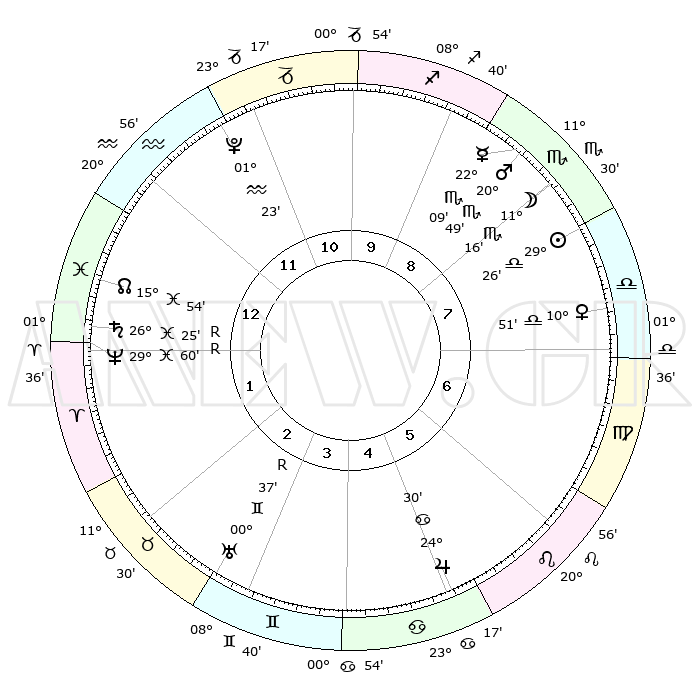 | ΘΕΣΕΙΣ ΠΛΑΝΗΤΩΝ ΑΣΤΡΟΛΟΓΙΚΟΥ ΧΑΡΤΗ ΤΗΣ ΣΤΙΓΜΗΣ ΑΥΤΗΣ | | Πλανήτης | Ζώδιο | Μοίρες | Δεκαήμ. | Σε οίκο | Απόκλιση | | Ακμές των οίκων | Ηλιος | Ζυγός | 29°04' | Τρίτο | 12 | 11 S 08 | | 1ος | 06°49' | Σκορπιός | Σελήνη | Σκορπιός | 06°48' | Πρώτο | 12 | 17 S 27 | | 2ος | 05°40' | Τοξότης | Ερμής | Σκορπιός | 21°41' | Τρίτο | 1 | 20 S 31 | | 3ος | 08°13' | Αιγόκερως | Αφροδίτη | Ζυγός | 10°23' | Δεύτερο | 11 | 02 S 42 | | 4ος | 12°54' | Υδροχόος | Αρης | Σκορπιός | 20°33' | Τρίτο | 1 | 18 S 10 | | 5ος | 15°41' | Ιχθείς | Δίας | Καρκίνος | 24°28' | Τρίτο | 9 | 21 N 17 | | 6ος | 13°40' | Κριός | Κρόνος | Ιχθείς | 26°26'R | Τρίτο | 5 | 03 S 42 | | 7ος | 06°49' | Ταύρος | Ουρανός | Δίδυμοι | 00°38'R | Πρώτο | 7 | 20 N 04 | | 8ος | 05°40' | Δίδυμοι | Ποσειδώνας | Κριός | 00°00'R | Πρώτο | 5 | 01 S 15 | | 9ος | 08°13' | Καρκίνος | Πλούτωνας | Υδροχόος | 01°23' | Πρώτο | 3 | 23 S 32 | | 10ος | 12°54' | Λέων | Β. Δεσμός | Ιχθείς | 15°55' | Δεύτερο | 5 | 05 S 33 | | 11ος | 15°41' | Παρθένος | Ωροσκόπος | Σκορπιός | 06°49' | Πρώτο | | | 12ος | 13°40' | Ζυγός | Μεσουράνημα | Λέων | 12°54' | Δεύτερο | | | |