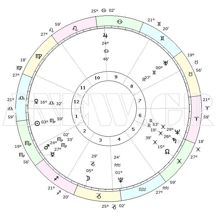 | | ΘΕΣΕΙΣ ΠΛΑΝΗΤΩΝ ΑΣΤΡΟΛΟΓΙΚΟΥ ΧΑΡΤΗ ΤΗΣ ΣΤΙΓΜΗΣ ΑΥΤΗΣ | | | | Πλανήτης | Ζώδιο | Μοίρες | Δεκαήμ. | Σε οίκο | Απόκλιση | | Ακμές των οίκων | | Ηλιος | Σκορπιός | 03°53' | Πρώτο | 2 | 12 S 48 | | 1ος | 20°42' | Παρθένος | | Σελήνη | Αιγόκερως | 04°12' | Πρώτο | 4 | 28 S 16 | | 2ος | 16°34' | Ζυγός | | Ερμής | Σκορπιός | 27°26' | Τρίτο | 3 | 22 S 15 | | 3ος | 16°37' | Σκορπιός | | Αφροδίτη | Ζυγός | 16°24' | Δεύτερο | 1 | 05 S 03 | | 4ος | 19°32' | Τοξότης | | Αρης | Σκορπιός | 23°58' | Τρίτο | 3 | 19 S 06 | | 5ος | 22°42' | Αιγόκερως | | Δίας | Καρκίνος | 24°45' | Τρίτο | 11 | 21 N 15 | | 6ος | 23°30' | Υδροχόος | | Κρόνος | Ιχθείς | 26°10'R | Τρίτο | 7 | 03 S 48 | | 7ος | 20°42' | Ιχθείς | | Ουρανός | Δίδυμοι | 00°27'R | Πρώτο | 9 | 20 N 02 | | 8ος | 16°34' | Κριός | | Ποσειδώνας | Ιχθείς | 29°53'R | Τρίτο | 7 | 01 S 18 | | 9ος | 16°37' | Ταύρος | | Πλούτωνας | Υδροχόος | 01°24' | Πρώτο | 5 | 23 S 31 | | 10ος | 19°32' | Δίδυμοι | | Β. Δεσμός | Ιχθείς | 15°40' | Δεύτερο | 6 | 05 S 39 | | 11ος | 22°42' | Καρκίνος | | Ωροσκόπος | Παρθένος | 20°42' | Τρίτο | | | 12ος | 23°30' | Λέων | | Μεσουράνημα | Δίδυμοι | 19°32' | Δεύτερο | | | |