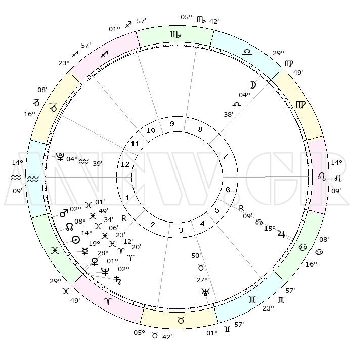 | | ΘΕΣΕΙΣ ΠΛΑΝΗΤΩΝ ΑΣΤΡΟΛΟΓΙΚΟΥ ΧΑΡΤΗ ΤΗΣ ΣΤΙΓΜΗΣ ΑΥΤΗΣ | | | | Πλανήτης | Ζώδιο | Μοίρες | Δεκαήμ. | Σε οίκο | Απόκλιση | | Ακμές των οίκων | | Ηλιος | Ιχθείς | 14°30' | Δεύτερο | 2 | 06 S 06 | | 1ος | 14°50' | Αιγόκερως | | Σελήνη | Ζυγός | 03°44' | Πρώτο | 8 | 03 S 31 | | 2ος | 25°45' | Υδροχόος | | Ερμής | Ιχθείς | 19°10'R | Δεύτερο | 2 | 00 S 54 | | 3ος | 05°53' | Κριός | | Αφροδίτη | Ιχθείς | 28°18' | Τρίτο | 2 | 01 S 51 | | 4ος | 07°08' | Ταύρος | | Αρης | Ιχθείς | 01°58' | Πρώτο | 2 | 11 S 48 | | 5ος | 01°22' | Δίδυμοι | | Δίας | Καρκίνος | 15°09'R | Δεύτερο | 7 | 22 N 55 | | 6ος | 22°36' | Δίδυμοι | | Κρόνος | Κριός | 02°20' | Πρώτο | 2 | 01 S 02 | | 7ος | 14°50' | Καρκίνος | | Ουρανός | Ταύρος | 27°50' | Τρίτο | 4 | 19 N 30 | | 8ος | 25°45' | Λέων | | Ποσειδώνας | Κριός | 01°12' | Πρώτο | 2 | 00 S 43 | | 9ος | 05°53' | Ζυγός | | Πλούτωνας | Υδροχόος | 04°39' | Πρώτο | 1 | 22 S 51 | | 10ος | 07°08' | Σκορπιός | | Β. Δεσμός | Ιχθείς | 08°50' | Πρώτο | 2 | 08 S 15 | | 11ος | 01°22' | Τοξότης | | Ωροσκόπος | Αιγόκερως | 14°50' | Δεύτερο | | | 12ος | 22°36' | Τοξότης | | Μεσουράνημα | Σκορπιός | 07°08' | Πρώτο | | | |