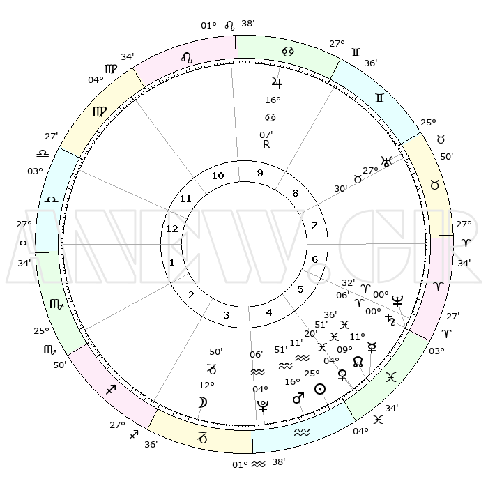 | | ΘΕΣΕΙΣ ΠΛΑΝΗΤΩΝ ΑΣΤΡΟΛΟΓΙΚΟΥ ΧΑΡΤΗ ΤΗΣ ΣΤΙΓΜΗΣ ΑΥΤΗΣ | | | | Πλανήτης | Ζώδιο | Μοίρες | Δεκαήμ. | Σε οίκο | Απόκλιση | | Ακμές των οίκων | | Ηλιος | Υδροχόος | 25°07' | Τρίτο | 5 | 13 S 09 | | 1ος | 10°03' | Ζυγός | | Σελήνη | Αιγόκερως | 12°06' | Δεύτερο | 4 | 27 S 17 | | 2ος | 07°19' | Σκορπιός | | Ερμής | Ιχθείς | 11°30' | Δεύτερο | 5 | 07 S 26 | | 3ος | 08°08' | Τοξότης | | Αφροδίτη | Ιχθείς | 04°15' | Πρώτο | 5 | 11 S 19 | | 4ος | 11°19' | Αιγόκερως | | Αρης | Υδροχόος | 16°48' | Δεύτερο | 5 | 16 S 50 | | 5ος | 14°15' | Υδροχόος | | Δίας | Καρκίνος | 16°07'R | Δεύτερο | 10 | 22 N 47 | | 6ος | 14°16' | Ιχθείς | | Κρόνος | Κριός | 00°06' | Πρώτο | 6 | 01 S 56 | | 7ος | 10°03' | Κριός | | Ουρανός | Ταύρος | 27°30' | Τρίτο | 8 | 19 N 25 | | 8ος | 07°19' | Ταύρος | | Ποσειδώνας | Κριός | 00°32' | Πρώτο | 6 | 01 S 00 | | 9ος | 08°08' | Δίδυμοι | | Πλούτωνας | Υδροχόος | 04°06' | Πρώτο | 4 | 22 S 57 | | 10ος | 11°19' | Καρκίνος | | Β. Δεσμός | Ιχθείς | 09°51' | Πρώτο | 5 | 07 S 52 | | 11ος | 14°15' | Λέων | | Ωροσκόπος | Ζυγός | 10°03' | Δεύτερο | | | 12ος | 14°16' | Παρθένος | | Μεσουράνημα | Καρκίνος | 11°19' | Δεύτερο | | | |