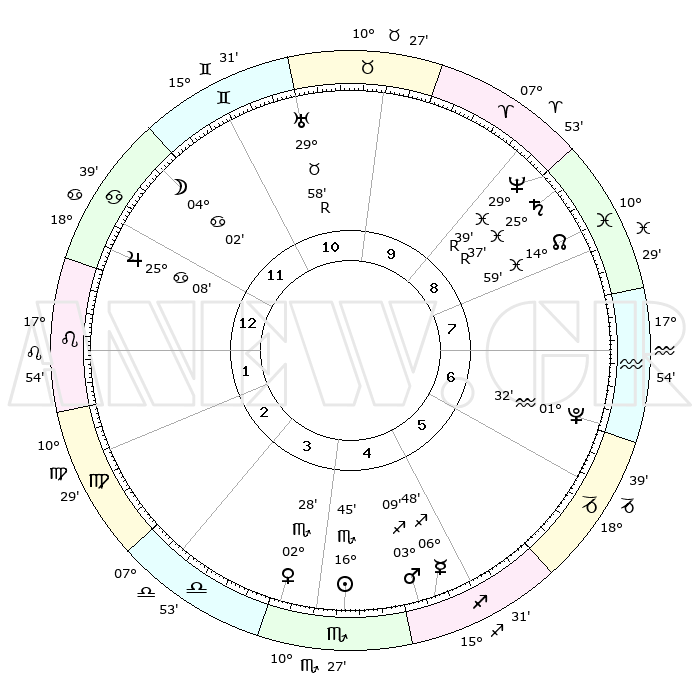 | | ΘΕΣΕΙΣ ΠΛΑΝΗΤΩΝ ΑΣΤΡΟΛΟΓΙΚΟΥ ΧΑΡΤΗ ΤΗΣ ΣΤΙΓΜΗΣ ΑΥΤΗΣ | | | | Πλανήτης | Ζώδιο | Μοίρες | Δεκαήμ. | Σε οίκο | Απόκλιση | | Ακμές των οίκων | | Ηλιος | Σκορπιός | 16°39' | Δεύτερο | 5 | 16 S 49 | | 1ος | 22°48' | Καρκίνος | | Σελήνη | Καρκίνος | 02°47' | Πρώτο | 12 | 28 N 16 | | 2ος | 13°26' | Λέων | | Ερμής | Τοξότης | 06°48' | Πρώτο | 5 | 23 S 53 | | 3ος | 07°32' | Παρθένος | | Αφροδίτη | Σκορπιός | 02°22' | Πρώτο | 4 | 11 S 01 | | 4ος | 07°34' | Ζυγός | | Αρης | Τοξότης | 03°05' | Πρώτο | 5 | 21 S 14 | | 5ος | 13°38' | Σκορπιός | | Δίας | Καρκίνος | 25°08' | Τρίτο | 1 | 21 N 12 | | 6ος | 20°34' | Τοξότης | | Κρόνος | Ιχθείς | 25°37'R | Τρίτο | 9 | 03 S 59 | | 7ος | 22°48' | Αιγόκερως | | Ουρανός | Ταύρος | 29°58'R | Τρίτο | 11 | 19 N 56 | | 8ος | 13°26' | Υδροχόος | | Ποσειδώνας | Ιχθείς | 29°39'R | Τρίτο | 9 | 01 S 24 | | 9ος | 07°32' | Ιχθείς | | Πλούτωνας | Υδροχόος | 01°32' | Πρώτο | 7 | 23 S 29 | | 10ος | 07°34' | Κριός | | Β. Δεσμός | Ιχθείς | 14°59' | Δεύτερο | 9 | 05 S 55 | | 11ος | 13°38' | Ταύρος | | Ωροσκόπος | Καρκίνος | 22°48' | Τρίτο | | | 12ος | 20°34' | Δίδυμοι | | Μεσουράνημα | Κριός | 07°34' | Πρώτο | | | |