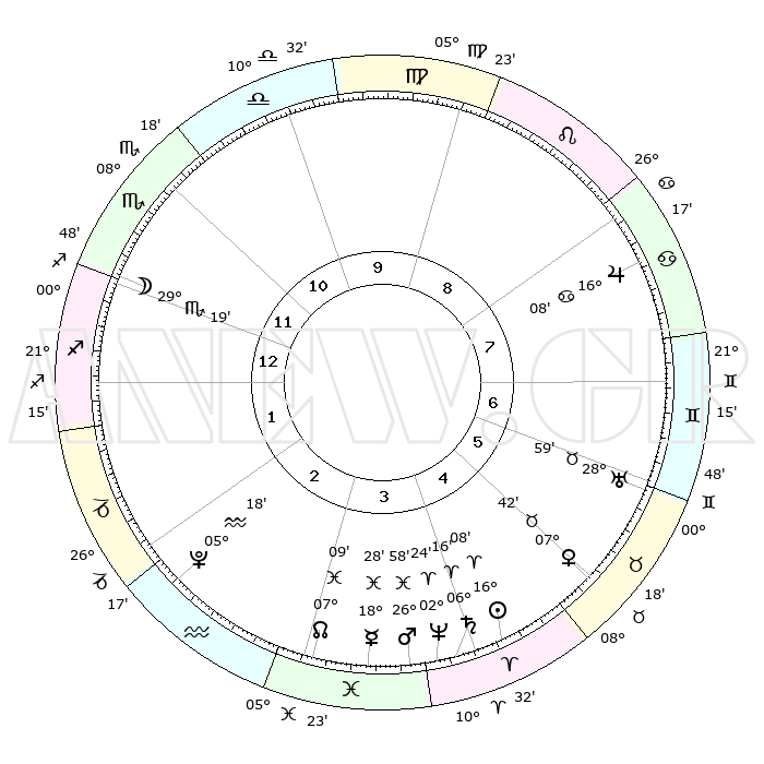 | | ΘΕΣΕΙΣ ΠΛΑΝΗΤΩΝ ΑΣΤΡΟΛΟΓΙΚΟΥ ΧΑΡΤΗ ΤΗΣ ΣΤΙΓΜΗΣ ΑΥΤΗΣ | | | | Πλανήτης | Ζώδιο | Μοίρες | Δεκαήμ. | Σε οίκο | Απόκλιση | | Ακμές των οίκων | | Ηλιος | Κριός | 16°04' | Δεύτερο | 5 | 06 N 19 | | 1ος | 29°55' | Σκορπιός | | Σελήνη | Σκορπιός | 28°28' | Τρίτο | 12 | 24 S 46 | | 2ος | 01°02' | Αιγόκερως | | Ερμής | Ιχθείς | 18°23' | Δεύτερο | 4 | 06 S 23 | | 3ος | 06°43' | Υδροχόος | | Αφροδίτη | Ταύρος | 07°37' | Πρώτο | 5 | 13 N 49 | | 4ος | 12°46' | Ιχθείς | | Αρης | Ιχθείς | 26°55' | Τρίτο | 4 | 02 S 10 | | 5ος | 13°49' | Κριός | | Δίας | Καρκίνος | 16°08' | Δεύτερο | 8 | 22 N 50 | | 6ος | 08°52' | Ταύρος | | Κρόνος | Κριός | 06°16' | Πρώτο | 4 | 00 N 32 | | 7ος | 29°55' | Ταύρος | | Ουρανός | Ταύρος | 28°59' | Τρίτο | 6 | 19 N 46 | | 8ος | 01°02' | Καρκίνος | | Ποσειδώνας | Κριός | 02°23' | Πρώτο | 4 | 00 S 15 | | 9ος | 06°43' | Λέων | | Πλούτωνας | Υδροχόος | 05°17' | Πρώτο | 2 | 22 S 47 | | 10ος | 12°46' | Παρθένος | | Β. Δεσμός | Ιχθείς | 07°09' | Πρώτο | 3 | 08 S 53 | | 11ος | 13°49' | Ζυγός | | Ωροσκόπος | Σκορπιός | 29°55' | Τρίτο | | | 12ος | 08°52' | Σκορπιός | | Μεσουράνημα | Παρθένος | 12°46' | Δεύτερο | | | |