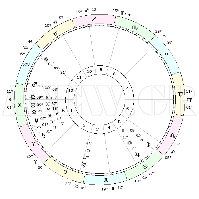 | | ΘΕΣΕΙΣ ΠΛΑΝΗΤΩΝ ΑΣΤΡΟΛΟΓΙΚΟΥ ΧΑΡΤΗ ΤΗΣ ΣΤΙΓΜΗΣ ΑΥΤΗΣ | | | | Πλανήτης | Ζώδιο | Μοίρες | Δεκαήμ. | Σε οίκο | Απόκλιση | | Ακμές των οίκων | | Ηλιος | Ιχθείς | 09°33' | Πρώτο | 1 | 07 S 59 | | 1ος | 04°38' | Υδροχόος | | Σελήνη | Καρκίνος | 27°09' | Τρίτο | 6 | 24 N 11 | | 2ος | 19°25' | Ιχθείς | | Ερμής | Ιχθείς | 22°17'R | Τρίτο | 2 | 00 S 10 | | 3ος | 27°06' | Κριός | | Αφροδίτη | Ιχθείς | 22°09' | Τρίτο | 2 | 04 S 22 | | 4ος | 24°47' | Ταύρος | | Αρης | Υδροχόος | 28°05' | Τρίτο | 1 | 13 S 10 | | 5ος | 17°14' | Δίδυμοι | | Δίας | Καρκίνος | 15°17'R | Δεύτερο | 6 | 22 N 54 | | 6ος | 08°51' | Καρκίνος | | Κρόνος | Κριός | 01°44' | Πρώτο | 2 | 01 S 16 | | 7ος | 04°38' | Λέων | | Ουρανός | Ταύρος | 27°43' | Τρίτο | 4 | 19 N 28 | | 8ος | 19°25' | Παρθένος | | Ποσειδώνας | Κριός | 01°01' | Πρώτο | 2 | 00 S 48 | | 9ος | 27°06' | Ζυγός | | Πλούτωνας | Υδροχόος | 04°31' | Πρώτο | 12 | 22 S 53 | | 10ος | 24°47' | Σκορπιός | | Β. Δεσμός | Ιχθείς | 09°05' | Πρώτο | 1 | 08 S 10 | | 11ος | 17°14' | Τοξότης | | Ωροσκόπος | Υδροχόος | 04°38' | Πρώτο | | | 12ος | 08°51' | Αιγόκερως | | Μεσουράνημα | Σκορπιός | 24°47' | Τρίτο | | | |