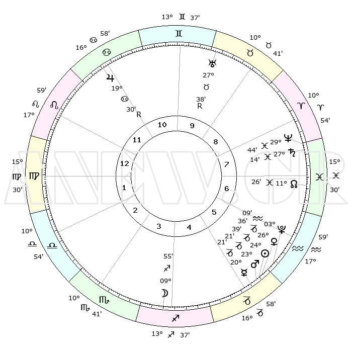 | | ΘΕΣΕΙΣ ΠΛΑΝΗΤΩΝ ΑΣΤΡΟΛΟΓΙΚΟΥ ΧΑΡΤΗ ΤΗΣ ΣΤΙΓΜΗΣ ΑΥΤΗΣ | | | | Πλανήτης | Ζώδιο | Μοίρες | Δεκαήμ. | Σε οίκο | Απόκλιση | | Ακμές των οίκων | | Ηλιος | Αιγόκερως | 24°35' | Τρίτο | 5 | 21 S 12 | | 1ος | 26°38' | Λέων | | Σελήνη | Τοξότης | 09°09' | Πρώτο | 4 | 26 S 53 | | 2ος | 20°08' | Παρθένος | | Ερμής | Αιγόκερως | 20°15' | Τρίτο | 5 | 23 S 39 | | 3ος | 18°29' | Ζυγός | | Αφροδίτη | Αιγόκερως | 26°31' | Τρίτο | 5 | 21 S 48 | | 4ος | 21°21' | Σκορπιός | | Αρης | Αιγόκερως | 23°18' | Τρίτο | 5 | 22 S 23 | | 5ος | 25°47' | Τοξότης | | Δίας | Καρκίνος | 19°31'R | Δεύτερο | 11 | 22 N 17 | | 6ος | 28°01' | Αιγόκερως | | Κρόνος | Ιχθείς | 27°14' | Τρίτο | 8 | 03 S 08 | | 7ος | 26°38' | Υδροχόος | | Ουρανός | Ταύρος | 27°38'R | Τρίτο | 10 | 19 N 26 | | 8ος | 20°08' | Ιχθείς | | Ποσειδώνας | Ιχθείς | 29°44' | Τρίτο | 8 | 01 S 19 | | 9ος | 18°29' | Κριός | | Πλούτωνας | Υδροχόος | 03°09' | Πρώτο | 6 | 23 S 08 | | 10ος | 21°21' | Ταύρος | | Β. Δεσμός | Ιχθείς | 11°26' | Δεύτερο | 7 | 07 S 16 | | 11ος | 25°47' | Δίδυμοι | | Ωροσκόπος | Λέων | 26°38' | Τρίτο | | | 12ος | 28°01' | Καρκίνος | | Μεσουράνημα | Ταύρος | 21°21' | Τρίτο | | | |