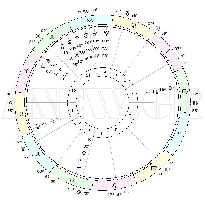 | | ΘΕΣΕΙΣ ΠΛΑΝΗΤΩΝ ΑΣΤΡΟΛΟΓΙΚΟΥ ΧΑΡΤΗ ΤΗΣ ΣΤΙΓΜΗΣ ΑΥΤΗΣ | | | | Πλανήτης | Ζώδιο | Μοίρες | Δεκαήμ. | Σε οίκο | Απόκλιση | | Ακμές των οίκων | | Ηλιος | Υδροχόος | 20°32' | Τρίτο | 12 | 14 S 38 | | 1ος | 28°07' | Ιχθείς | | Σελήνη | Σκορπιός | 17°58' | Δεύτερο | 8 | 21 S 53 | | 2ος | 08°52' | Ταύρος | | Ερμής | Ιχθείς | 04°05' | Πρώτο | 12 | 10 S 57 | | 3ος | 06°33' | Δίδυμοι | | Αφροδίτη | Υδροχόος | 28°35' | Τρίτο | 12 | 13 S 19 | | 4ος | 28°57' | Δίδυμοι | | Αρης | Υδροχόος | 13°14' | Δεύτερο | 11 | 17 S 52 | | 5ος | 21°10' | Καρκίνος | | Δίας | Καρκίνος | 16°30'R | Δεύτερο | 4 | 22 N 44 | | 6ος | 18°17' | Λέων | | Κρόνος | Ιχθείς | 29°36' | Τρίτο | 1 | 02 S 08 | | 7ος | 28°07' | Παρθένος | | Ουρανός | Ταύρος | 27°28' | Τρίτο | 2 | 19 N 24 | | 8ος | 08°52' | Σκορπιός | | Ποσειδώνας | Κριός | 00°23' | Πρώτο | 1 | 01 S 03 | | 9ος | 06°33' | Τοξότης | | Πλούτωνας | Υδροχόος | 03°58' | Πρώτο | 11 | 22 S 58 | | 10ος | 28°57' | Τοξότης | | Β. Δεσμός | Ιχθείς | 10°05' | Δεύτερο | 12 | 07 S 47 | | 11ος | 21°10' | Αιγόκερως | | Ωροσκόπος | Ιχθείς | 28°07' | Τρίτο | | | 12ος | 18°17' | Υδροχόος | | Μεσουράνημα | Τοξότης | 28°57' | Τρίτο | | | |