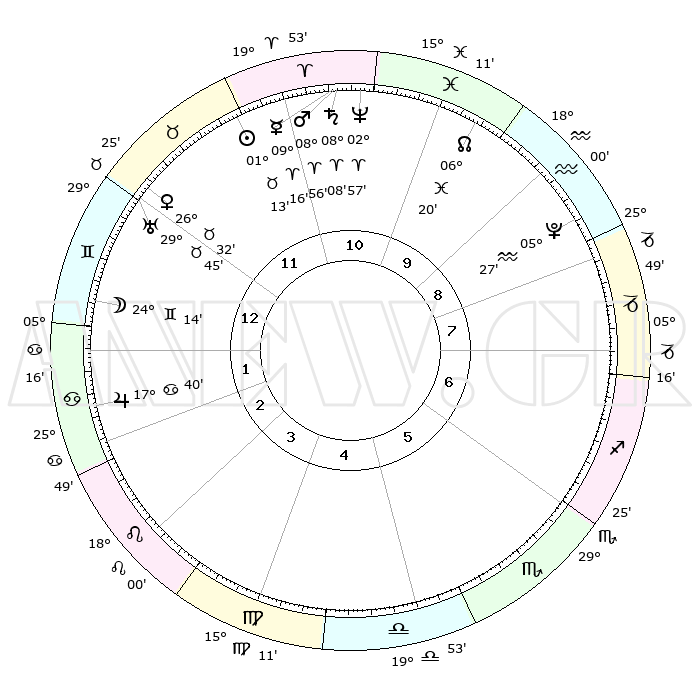 | | ΘΕΣΕΙΣ ΠΛΑΝΗΤΩΝ ΑΣΤΡΟΛΟΓΙΚΟΥ ΧΑΡΤΗ ΤΗΣ ΣΤΙΓΜΗΣ ΑΥΤΗΣ | | | | Πλανήτης | Ζώδιο | Μοίρες | Δεκαήμ. | Σε οίκο | Απόκλιση | | Ακμές των οίκων | | Ηλιος | Ταύρος | 01°09' | Πρώτο | 12 | 11 N 52 | | 1ος | 09°59' | Δίδυμοι | | Σελήνη | Δίδυμοι | 23°10' | Τρίτο | 1 | 28 N 10 | | 2ος | 02°59' | Καρκίνος | | Ερμής | Κριός | 09°09' | Πρώτο | 11 | 01 N 14 | | 3ος | 24°12' | Καρκίνος | | Αφροδίτη | Ταύρος | 26°27' | Τρίτο | 12 | 19 N 48 | | 4ος | 17°50' | Λέων | | Αρης | Κριός | 08°53' | Πρώτο | 11 | 02 N 39 | | 5ος | 18°07' | Παρθένος | | Δίας | Καρκίνος | 17°39' | Δεύτερο | 2 | 22 N 39 | | 6ος | 27°51' | Ζυγός | | Κρόνος | Κριός | 08°08' | Πρώτο | 11 | 01 N 15 | | 7ος | 09°59' | Τοξότης | | Ουρανός | Ταύρος | 29°45' | Τρίτο | 12 | 19 N 56 | | 8ος | 02°59' | Αιγόκερως | | Ποσειδώνας | Κριός | 02°57' | Πρώτο | 11 | 00 S 02 | | 9ος | 24°12' | Αιγόκερως | | Πλούτωνας | Υδροχόος | 05°27' | Πρώτο | 9 | 22 S 48 | | 10ος | 17°50' | Υδροχόος | | Β. Δεσμός | Ιχθείς | 06°20' | Πρώτο | 10 | 09 S 11 | | 11ος | 18°07' | Ιχθείς | | Ωροσκόπος | Δίδυμοι | 09°59' | Πρώτο | | | 12ος | 27°51' | Κριός | | Μεσουράνημα | Υδροχόος | 17°50' | Δεύτερο | | | |