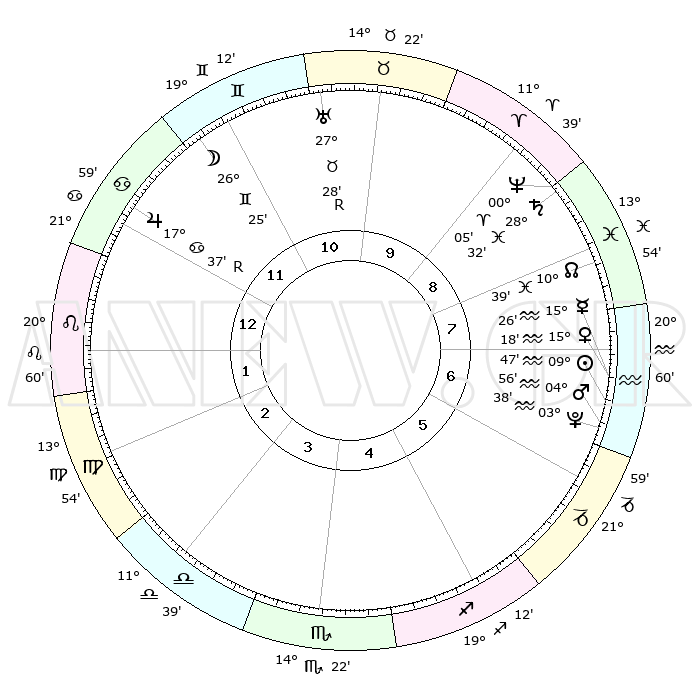 | | ΘΕΣΕΙΣ ΠΛΑΝΗΤΩΝ ΑΣΤΡΟΛΟΓΙΚΟΥ ΧΑΡΤΗ ΤΗΣ ΣΤΙΓΜΗΣ ΑΥΤΗΣ | | | | Πλανήτης | Ζώδιο | Μοίρες | Δεκαήμ. | Σε οίκο | Απόκλιση | | Ακμές των οίκων | | Ηλιος | Υδροχόος | 09°44' | Πρώτο | 7 | 17 S 49 | | 1ος | 03°41' | Λέων | | Σελήνη | Δίδυμοι | 25°33' | Τρίτο | 11 | 28 N 21 | | 2ος | 24°59' | Λέων | | Ερμής | Υδροχόος | 15°19' | Δεύτερο | 7 | 18 S 09 | | 3ος | 20°32' | Παρθένος | | Αφροδίτη | Υδροχόος | 15°13' | Δεύτερο | 7 | 17 S 32 | | 4ος | 22°00' | Ζυγός | | Αρης | Υδροχόος | 04°53' | Πρώτο | 7 | 20 S 03 | | 5ος | 27°56' | Σκορπιός | | Δίας | Καρκίνος | 17°38'R | Δεύτερο | 12 | 22 N 34 | | 6ος | 03°02' | Αιγόκερως | | Κρόνος | Ιχθείς | 28°32' | Τρίτο | 9 | 02 S 35 | | 7ος | 03°41' | Υδροχόος | | Ουρανός | Ταύρος | 27°28'R | Τρίτο | 10 | 19 N 24 | | 8ος | 24°59' | Υδροχόος | | Ποσειδώνας | Κριός | 00°05' | Πρώτο | 9 | 01 S 11 | | 9ος | 20°32' | Ιχθείς | | Πλούτωνας | Υδροχόος | 03°38' | Πρώτο | 6 | 23 S 02 | | 10ος | 22°00' | Κριός | | Β. Δεσμός | Ιχθείς | 10°39' | Δεύτερο | 8 | 07 S 34 | | 11ος | 27°56' | Ταύρος | | Ωροσκόπος | Λέων | 03°41' | Πρώτο | | | 12ος | 03°02' | Καρκίνος | | Μεσουράνημα | Κριός | 22°00' | Τρίτο | | | |