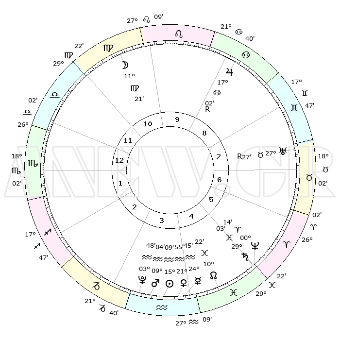| | ΘΕΣΕΙΣ ΠΛΑΝΗΤΩΝ ΑΣΤΡΟΛΟΓΙΚΟΥ ΧΑΡΤΗ ΤΗΣ ΣΤΙΓΜΗΣ ΑΥΤΗΣ | | | | Πλανήτης | Ζώδιο | Μοίρες | Δεκαήμ. | Σε οίκο | Απόκλιση | | Ακμές των οίκων | | Ηλιος | Υδροχόος | 15°05' | Δεύτερο | 4 | 16 S 18 | | 1ος | 29°55' | Ζυγός | | Σελήνη | Παρθένος | 10°30' | Δεύτερο | 11 | 07 N 30 | | 2ος | 28°20' | Σκορπιός | | Ερμής | Υδροχόος | 24°39' | Τρίτο | 4 | 14 S 52 | | 3ος | 00°17' | Αιγόκερως | | Αφροδίτη | Υδροχόος | 21°51' | Τρίτο | 4 | 15 S 33 | | 4ος | 04°28' | Υδροχόος | | Αρης | Υδροχόος | 09°01' | Πρώτο | 4 | 19 S 01 | | 5ος | 07°23' | Ιχθείς | | Δίας | Καρκίνος | 17°02'R | Δεύτερο | 9 | 22 N 39 | | 6ος | 06°04' | Κριός | | Κρόνος | Ιχθείς | 29°03' | Τρίτο | 5 | 02 S 22 | | 7ος | 29°55' | Κριός | | Ουρανός | Ταύρος | 27°27'R | Τρίτο | 7 | 19 N 24 | | 8ος | 28°20' | Ταύρος | | Ποσειδώνας | Κριός | 00°14' | Πρώτο | 5 | 01 S 07 | | 9ος | 00°17' | Καρκίνος | | Πλούτωνας | Υδροχόος | 03°48' | Πρώτο | 3 | 23 S 00 | | 10ος | 04°28' | Λέων | | Β. Δεσμός | Ιχθείς | 10°22' | Δεύτερο | 5 | 07 S 41 | | 11ος | 07°23' | Παρθένος | | Ωροσκόπος | Ζυγός | 29°55' | Τρίτο | | | 12ος | 06°04' | Ζυγός | | Μεσουράνημα | Λέων | 04°28' | Πρώτο | | | |