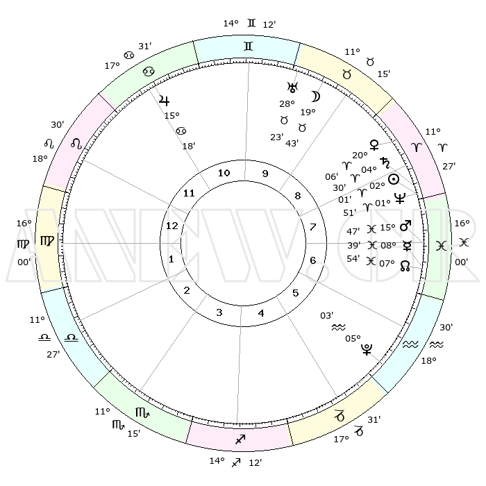 | | ΘΕΣΕΙΣ ΠΛΑΝΗΤΩΝ ΑΣΤΡΟΛΟΓΙΚΟΥ ΧΑΡΤΗ ΤΗΣ ΣΤΙΓΜΗΣ ΑΥΤΗΣ | | | | Πλανήτης | Ζώδιο | Μοίρες | Δεκαήμ. | Σε οίκο | Απόκλιση | | Ακμές των οίκων | | Ηλιος | Κριός | 01°57' | Πρώτο | 8 | 00 N 46 | | 1ος | 26°31' | Λέων | | Σελήνη | Ταύρος | 18°45' | Δεύτερο | 9 | 22 N 07 | | 2ος | 20°01' | Παρθένος | | Ερμής | Ιχθείς | 08°39' | Πρώτο | 7 | 07 S 48 | | 3ος | 18°21' | Ζυγός | | Αφροδίτη | Κριός | 20°01' | Τρίτο | 9 | 07 N 05 | | 4ος | 21°13' | Σκορπιός | | Αρης | Ιχθείς | 15°44' | Δεύτερο | 7 | 06 S 37 | | 5ος | 25°39' | Τοξότης | | Δίας | Καρκίνος | 15°18' | Δεύτερο | 11 | 22 N 55 | | 6ος | 27°54' | Αιγόκερως | | Κρόνος | Κριός | 04°29' | Πρώτο | 8 | 00 S 10 | | 7ος | 26°31' | Υδροχόος | | Ουρανός | Ταύρος | 28°23' | Τρίτο | 10 | 19 N 37 | | 8ος | 20°01' | Ιχθείς | | Ποσειδώνας | Κριός | 01°51' | Πρώτο | 8 | 00 S 28 | | 9ος | 18°21' | Κριός | | Πλούτωνας | Υδροχόος | 05°03' | Πρώτο | 6 | 22 S 48 | | 10ος | 21°13' | Ταύρος | | Β. Δεσμός | Ιχθείς | 07°54' | Πρώτο | 7 | 08 S 36 | | 11ος | 25°39' | Δίδυμοι | | Ωροσκόπος | Λέων | 26°31' | Τρίτο | | | 12ος | 27°54' | Καρκίνος | | Μεσουράνημα | Ταύρος | 21°13' | Τρίτο | | | |