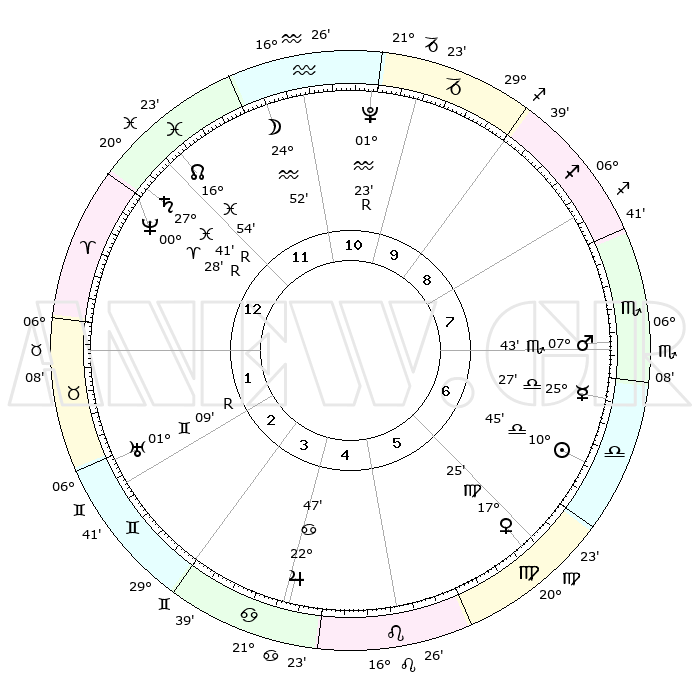 | ΘΕΣΕΙΣ ΠΛΑΝΗΤΩΝ ΑΣΤΡΟΛΟΓΙΚΟΥ ΧΑΡΤΗ ΤΗΣ ΣΤΙΓΜΗΣ ΑΥΤΗΣ | | Πλανήτης | Ζώδιο | Μοίρες | Δεκαήμ. | Σε οίκο | Απόκλιση | | Ακμές των οίκων | Ηλιος | Ζυγός | 10°41' | Δεύτερο | 7 | 04 S 14 | | 1ος | 27°38' | Ιχθείς | Σελήνη | Υδροχόος | 23°56' | Τρίτο | 12 | 15 S 35 | | 2ος | 08°29' | Ταύρος | Ερμής | Ζυγός | 25°21' | Τρίτο | 7 | 10 S 12 | | 3ος | 06°15' | Δίδυμοι | Αφροδίτη | Παρθένος | 17°20' | Δεύτερο | 6 | 06 N 14 | | 4ος | 28°40' | Δίδυμοι | Αρης | Σκορπιός | 07°41' | Πρώτο | 7 | 14 S 10 | | 5ος | 20°52' | Καρκίνος | Δίας | Καρκίνος | 22°47' | Τρίτο | 5 | 21 N 32 | | 6ος | 17°55' | Λέων | Κρόνος | Ιχθείς | 27°41'R | Τρίτο | 1 | 03 S 13 | | 7ος | 27°38' | Παρθένος | Ουρανός | Δίδυμοι | 01°09'R | Πρώτο | 2 | 20 N 11 | | 8ος | 08°29' | Σκορπιός | Ποσειδώνας | Κριός | 00°28'R | Πρώτο | 1 | 01 S 04 | | 9ος | 06°15' | Τοξότης | Πλούτωνας | Υδροχόος | 01°23'R | Πρώτο | 11 | 23 S 32 | | 10ος | 28°40' | Τοξότης | Β. Δεσμός | Ιχθείς | 16°54' | Δεύτερο | 12 | 05 S 10 | | 11ος | 20°52' | Αιγόκερως | Ωροσκόπος | Ιχθείς | 27°38' | Τρίτο | | | 12ος | 17°55' | Υδροχόος | Μεσουράνημα | Τοξότης | 28°40' | Τρίτο | | | |