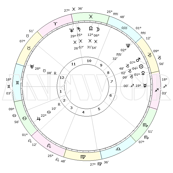 | | ΘΕΣΕΙΣ ΠΛΑΝΗΤΩΝ ΑΣΤΡΟΛΟΓΙΚΟΥ ΧΑΡΤΗ ΤΗΣ ΣΤΙΓΜΗΣ ΑΥΤΗΣ | | | | Πλανήτης | Ζώδιο | Μοίρες | Δεκαήμ. | Σε οίκο | Απόκλιση | | Ακμές των οίκων | | Ηλιος | Αιγόκερως | 03°57' | Πρώτο | 8 | 23 S 22 | | 1ος | 14°37' | Ταύρος | | Σελήνη | Ιχθείς | 05°52' | Πρώτο | 11 | 09 S 48 | | 2ος | 12°57' | Δίδυμοι | | Ερμής | Τοξότης | 18°53' | Δεύτερο | 8 | 22 S 46 | | 3ος | 05°13' | Καρκίνος | | Αφροδίτη | Αιγόκερως | 01°03' | Πρώτο | 8 | 23 S 41 | | 4ος | 27°10' | Καρκίνος | | Αρης | Αιγόκερως | 07°44' | Πρώτο | 9 | 24 S 03 | | 5ος | 23°16' | Λέων | | Δίας | Καρκίνος | 22°11'R | Τρίτο | 3 | 21 N 50 | | 6ος | 28°54' | Παρθένος | | Κρόνος | Ιχθείς | 25°57' | Τρίτο | 11 | 03 S 42 | | 7ος | 14°37' | Σκορπιός | | Ουρανός | Ταύρος | 28°08'R | Τρίτο | 1 | 19 N 33 | | 8ος | 12°57' | Τοξότης | | Ποσειδώνας | Ιχθείς | 29°26' | Τρίτο | 12 | 01 S 27 | | 9ος | 05°13' | Αιγόκερως | | Πλούτωνας | Υδροχόος | 02°32' | Πρώτο | 10 | 23 S 16 | | 10ος | 27°10' | Αιγόκερως | | Β. Δεσμός | Ιχθείς | 12°31' | Δεύτερο | 11 | 06 S 52 | | 11ος | 23°16' | Υδροχόος | | Ωροσκόπος | Ταύρος | 14°37' | Δεύτερο | | | 12ος | 28°54' | Ιχθείς | | Μεσουράνημα | Αιγόκερως | 27°10' | Τρίτο | | | |