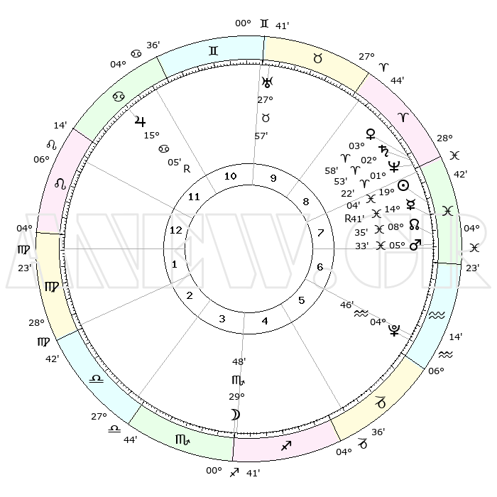 | | ΘΕΣΕΙΣ ΠΛΑΝΗΤΩΝ ΑΣΤΡΟΛΟΓΙΚΟΥ ΧΑΡΤΗ ΤΗΣ ΣΤΙΓΜΗΣ ΑΥΤΗΣ | | | | Πλανήτης | Ζώδιο | Μοίρες | Δεκαήμ. | Σε οίκο | Απόκλιση | | Ακμές των οίκων | | Ηλιος | Ιχθείς | 19°00' | Δεύτερο | 8 | 04 S 21 | | 1ος | 19°03' | Λέων | | Σελήνη | Σκορπιός | 29°10' | Τρίτο | 4 | 25 S 02 | | 2ος | 11°46' | Παρθένος | | Ερμής | Ιχθείς | 14°44'R | Δεύτερο | 8 | 02 S 50 | | 3ος | 09°17' | Ζυγός | | Αφροδίτη | Κριός | 03°54' | Πρώτο | 8 | 00 N 28 | | 4ος | 11°55' | Σκορπιός | | Αρης | Ιχθείς | 05°31' | Πρώτο | 7 | 10 S 30 | | 5ος | 16°54' | Τοξότης | | Δίας | Καρκίνος | 15°05'R | Δεύτερο | 11 | 22 N 56 | | 6ος | 19°54' | Αιγόκερως | | Κρόνος | Κριός | 02°53' | Πρώτο | 8 | 00 S 48 | | 7ος | 19°03' | Υδροχόος | | Ουρανός | Ταύρος | 27°57' | Τρίτο | 10 | 19 N 31 | | 8ος | 11°46' | Ιχθείς | | Ποσειδώνας | Κριός | 01°22' | Πρώτο | 8 | 00 S 39 | | 9ος | 09°17' | Κριός | | Πλούτωνας | Υδροχόος | 04°45' | Πρώτο | 6 | 22 S 50 | | 10ος | 11°55' | Ταύρος | | Β. Δεσμός | Ιχθείς | 08°35' | Πρώτο | 7 | 08 S 21 | | 11ος | 16°54' | Δίδυμοι | | Ωροσκόπος | Λέων | 19°03' | Δεύτερο | | | 12ος | 19°54' | Καρκίνος | | Μεσουράνημα | Ταύρος | 11°55' | Δεύτερο | | | |