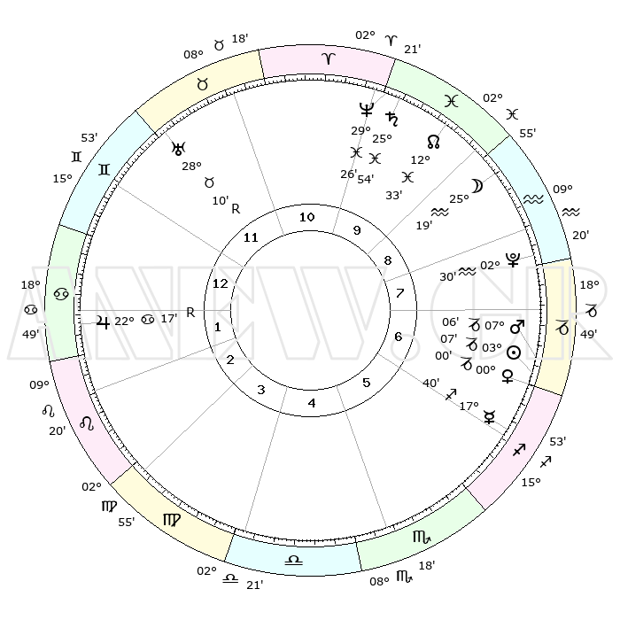 | | ΘΕΣΕΙΣ ΠΛΑΝΗΤΩΝ ΑΣΤΡΟΛΟΓΙΚΟΥ ΧΑΡΤΗ ΤΗΣ ΣΤΙΓΜΗΣ ΑΥΤΗΣ | | | | Πλανήτης | Ζώδιο | Μοίρες | Δεκαήμ. | Σε οίκο | Απόκλιση | | Ακμές των οίκων | | Ηλιος | Αιγόκερως | 03°02' | Πρώτο | 7 | 23 S 24 | | 1ος | 23°15' | Δίδυμοι | | Σελήνη | Υδροχόος | 24°18' | Τρίτο | 9 | 14 S 49 | | 2ος | 14°34' | Καρκίνος | | Ερμής | Τοξότης | 17°33' | Δεύτερο | 6 | 22 S 33 | | 3ος | 06°00' | Λέων | | Αφροδίτη | Τοξότης | 29°54' | Τρίτο | 7 | 23 S 39 | | 4ος | 01°18' | Παρθένος | | Αρης | Αιγόκερως | 07°03' | Πρώτο | 7 | 24 S 05 | | 5ος | 04°05' | Ζυγός | | Δίας | Καρκίνος | 22°17'R | Τρίτο | 2 | 21 N 48 | | 6ος | 14°22' | Σκορπιός | | Κρόνος | Ιχθείς | 25°54' | Τρίτο | 10 | 03 S 44 | | 7ος | 23°15' | Τοξότης | | Ουρανός | Ταύρος | 28°10'R | Τρίτο | 12 | 19 N 33 | | 8ος | 14°34' | Αιγόκερως | | Ποσειδώνας | Ιχθείς | 29°26' | Τρίτο | 10 | 01 S 27 | | 9ος | 06°00' | Υδροχόος | | Πλούτωνας | Υδροχόος | 02°30' | Πρώτο | 8 | 23 S 16 | | 10ος | 01°18' | Ιχθείς | | Β. Δεσμός | Ιχθείς | 12°34' | Δεύτερο | 10 | 06 S 51 | | 11ος | 04°05' | Κριός | | Ωροσκόπος | Δίδυμοι | 23°15' | Τρίτο | | | 12ος | 14°22' | Ταύρος | | Μεσουράνημα | Ιχθείς | 01°18' | Πρώτο | | | |