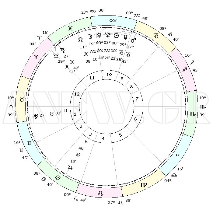 | | ΘΕΣΕΙΣ ΠΛΑΝΗΤΩΝ ΑΣΤΡΟΛΟΓΙΚΟΥ ΧΑΡΤΗ ΤΗΣ ΣΤΙΓΜΗΣ ΑΥΤΗΣ | | | | Πλανήτης | Ζώδιο | Μοίρες | Δεκαήμ. | Σε οίκο | Απόκλιση | | Ακμές των οίκων | | Ηλιος | Υδροχόος | 00°17' | Πρώτο | 11 | 20 S 05 | | 1ος | 00°44' | Κριός | | Σελήνη | Υδροχόος | 18°01' | Δεύτερο | 11 | 17 S 14 | | 2ος | 10°51' | Ταύρος | | Ερμής | Αιγόκερως | 29°26' | Τρίτο | 11 | 22 S 14 | | 3ος | 08°08' | Δίδυμοι | | Αφροδίτη | Υδροχόος | 03°34' | Πρώτο | 11 | 20 S 27 | | 4ος | 00°25' | Καρκίνος | | Αρης | Αιγόκερως | 27°39' | Τρίτο | 11 | 21 S 36 | | 5ος | 22°45' | Καρκίνος | | Δίας | Καρκίνος | 18°46'R | Δεύτερο | 4 | 22 N 24 | | 6ος | 20°16' | Λέων | | Κρόνος | Ιχθείς | 27°41' | Τρίτο | 12 | 02 S 57 | | 7ος | 00°44' | Ζυγός | | Ουρανός | Ταύρος | 27°33'R | Τρίτο | 2 | 19 N 25 | | 8ος | 10°51' | Σκορπιός | | Ποσειδώνας | Ιχθείς | 29°51' | Τρίτο | 12 | 01 S 16 | | 9ος | 08°08' | Τοξότης | | Πλούτωνας | Υδροχόος | 03°20' | Πρώτο | 11 | 23 S 06 | | 10ος | 00°25' | Αιγόκερως | | Β. Δεσμός | Ιχθείς | 11°09' | Δεύτερο | 12 | 07 S 23 | | 11ος | 22°45' | Αιγόκερως | | Ωροσκόπος | Κριός | 00°44' | Πρώτο | | | 12ος | 20°16' | Υδροχόος | | Μεσουράνημα | Αιγόκερως | 00°25' | Πρώτο | | | |