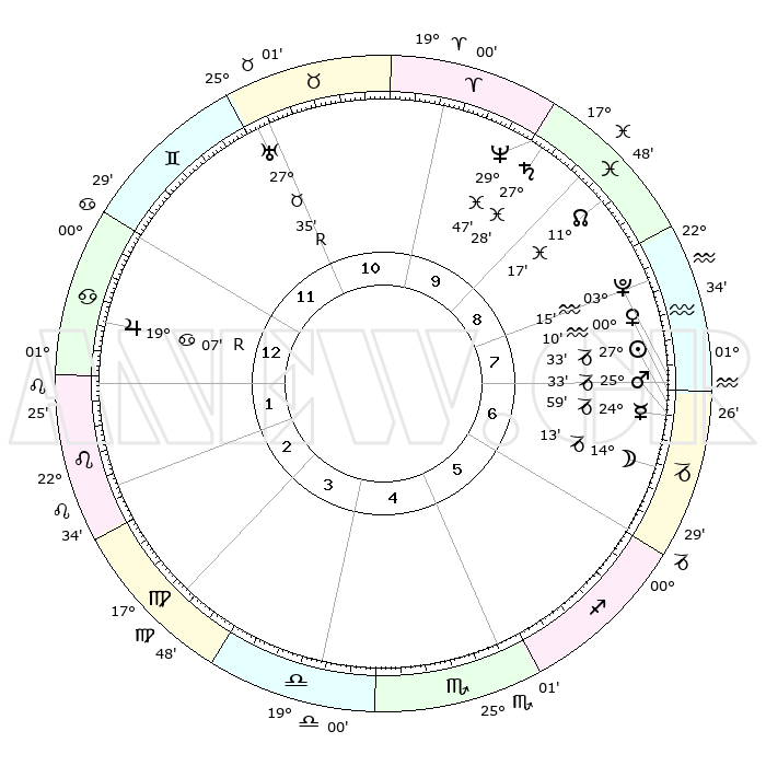 | | ΘΕΣΕΙΣ ΠΛΑΝΗΤΩΝ ΑΣΤΡΟΛΟΓΙΚΟΥ ΧΑΡΤΗ ΤΗΣ ΣΤΙΓΜΗΣ ΑΥΤΗΣ | | | | Πλανήτης | Ζώδιο | Μοίρες | Δεκαήμ. | Σε οίκο | Απόκλιση | | Ακμές των οίκων | | Ηλιος | Αιγόκερως | 27°28' | Τρίτο | 7 | 20 S 40 | | 1ος | 09°32' | Καρκίνος | | Σελήνη | Αιγόκερως | 13°20' | Δεύτερο | 7 | 27 S 01 | | 2ος | 29°58' | Καρκίνος | | Ερμής | Αιγόκερως | 24°52' | Τρίτο | 7 | 23 S 02 | | 3ος | 22°33' | Λέων | | Αφροδίτη | Υδροχόος | 00°05' | Πρώτο | 8 | 21 S 09 | | 4ος | 20°27' | Παρθένος | | Αρης | Αιγόκερως | 25°30' | Τρίτο | 7 | 22 S 00 | | 5ος | 25°40' | Ζυγός | | Δίας | Καρκίνος | 19°08'R | Δεύτερο | 1 | 22 N 21 | | 6ος | 04°41' | Τοξότης | | Κρόνος | Ιχθείς | 27°27' | Τρίτο | 10 | 03 S 02 | | 7ος | 09°32' | Αιγόκερως | | Ουρανός | Ταύρος | 27°35'R | Τρίτο | 11 | 19 N 26 | | 8ος | 29°59' | Αιγόκερως | | Ποσειδώνας | Ιχθείς | 29°47' | Τρίτο | 10 | 01 S 18 | | 9ος | 22°33' | Υδροχόος | | Πλούτωνας | Υδροχόος | 03°14' | Πρώτο | 8 | 23 S 07 | | 10ος | 20°27' | Ιχθείς | | Β. Δεσμός | Ιχθείς | 11°17' | Δεύτερο | 9 | 07 S 20 | | 11ος | 25°40' | Κριός | | Ωροσκόπος | Καρκίνος | 09°32' | Πρώτο | | | 12ος | 04°40' | Δίδυμοι | | Μεσουράνημα | Ιχθείς | 20°27' | Τρίτο | | | |