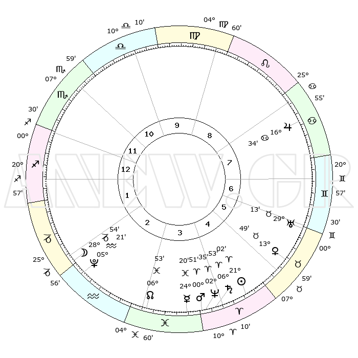| | ΘΕΣΕΙΣ ΠΛΑΝΗΤΩΝ ΑΣΤΡΟΛΟΓΙΚΟΥ ΧΑΡΤΗ ΤΗΣ ΣΤΙΓΜΗΣ ΑΥΤΗΣ | | | | Πλανήτης | Ζώδιο | Μοίρες | Δεκαήμ. | Σε οίκο | Απόκλιση | | Ακμές των οίκων | | Ηλιος | Κριός | 20°58' | Τρίτο | 5 | 08 N 11 | | 1ος | 27°49' | Σκορπιός | | Σελήνη | Αιγόκερως | 27°57' | Τρίτο | 2 | 23 S 50 | | 2ος | 28°39' | Τοξότης | | Ερμής | Ιχθείς | 24°14' | Τρίτο | 4 | 04 S 29 | | 3ος | 04°00' | Υδροχόος | | Αφροδίτη | Ταύρος | 13°43' | Δεύτερο | 6 | 15 N 56 | | 4ος | 09°59' | Ιχθείς | | Αρης | Κριός | 00°48' | Πρώτο | 4 | 00 S 36 | | 5ος | 11°17' | Κριός | | Δίας | Καρκίνος | 16°33' | Δεύτερο | 8 | 22 N 47 | | 6ος | 06°38' | Ταύρος | | Κρόνος | Κριός | 06°53' | Πρώτο | 4 | 00 N 46 | | 7ος | 27°49' | Ταύρος | | Ουρανός | Ταύρος | 29°13' | Τρίτο | 7 | 19 N 49 | | 8ος | 28°39' | Δίδυμοι | | Ποσειδώνας | Κριός | 02°34' | Πρώτο | 4 | 00 S 11 | | 9ος | 04°00' | Λέων | | Πλούτωνας | Υδροχόος | 05°21' | Πρώτο | 3 | 22 S 47 | | 10ος | 09°59' | Παρθένος | | Β. Δεσμός | Ιχθείς | 06°53' | Πρώτο | 3 | 08 S 59 | | 11ος | 11°17' | Ζυγός | | Ωροσκόπος | Σκορπιός | 27°49' | Τρίτο | | | 12ος | 06°38' | Σκορπιός | | Μεσουράνημα | Παρθένος | 09°59' | Πρώτο | | | |