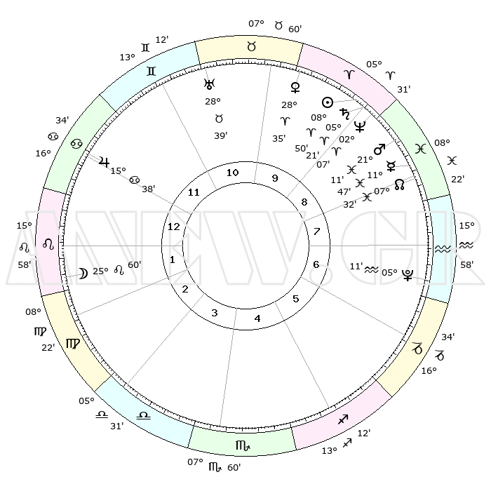 | | ΘΕΣΕΙΣ ΠΛΑΝΗΤΩΝ ΑΣΤΡΟΛΟΓΙΚΟΥ ΧΑΡΤΗ ΤΗΣ ΣΤΙΓΜΗΣ ΑΥΤΗΣ | | | | Πλανήτης | Ζώδιο | Μοίρες | Δεκαήμ. | Σε οίκο | Απόκλιση | | Ακμές των οίκων | | Ηλιος | Κριός | 08°46' | Πρώτο | 9 | 03 N 28 | | 1ος | 26°34' | Καρκίνος | | Σελήνη | Λέων | 25°06' | Τρίτο | 2 | 14 N 19 | | 2ος | 17°24' | Λέων | | Ερμής | Ιχθείς | 11°44' | Δεύτερο | 8 | 07 S 58 | | 3ος | 11°59' | Παρθένος | | Αφροδίτη | Κριός | 28°30' | Τρίτο | 10 | 10 N 26 | | 4ος | 12°34' | Ζυγός | | Αρης | Ιχθείς | 21°08' | Τρίτο | 9 | 04 S 29 | | 5ος | 18°40' | Σκορπιός | | Δίας | Καρκίνος | 15°37' | Δεύτερο | 12 | 22 N 53 | | 6ος | 24°57' | Τοξότης | | Κρόνος | Κριός | 05°21' | Πρώτο | 9 | 00 N 10 | | 7ος | 26°34' | Αιγόκερως | | Ουρανός | Ταύρος | 28°39' | Τρίτο | 11 | 19 N 41 | | 8ος | 17°24' | Υδροχόος | | Ποσειδώνας | Κριός | 02°07' | Πρώτο | 9 | 00 S 22 | | 9ος | 11°59' | Ιχθείς | | Πλούτωνας | Υδροχόος | 05°11' | Πρώτο | 7 | 22 S 48 | | 10ος | 12°34' | Κριός | | Β. Δεσμός | Ιχθείς | 07°32' | Πρώτο | 8 | 08 S 44 | | 11ος | 18°40' | Ταύρος | | Ωροσκόπος | Καρκίνος | 26°34' | Τρίτο | | | 12ος | 24°57' | Δίδυμοι | | Μεσουράνημα | Κριός | 12°34' | Δεύτερο | | | |