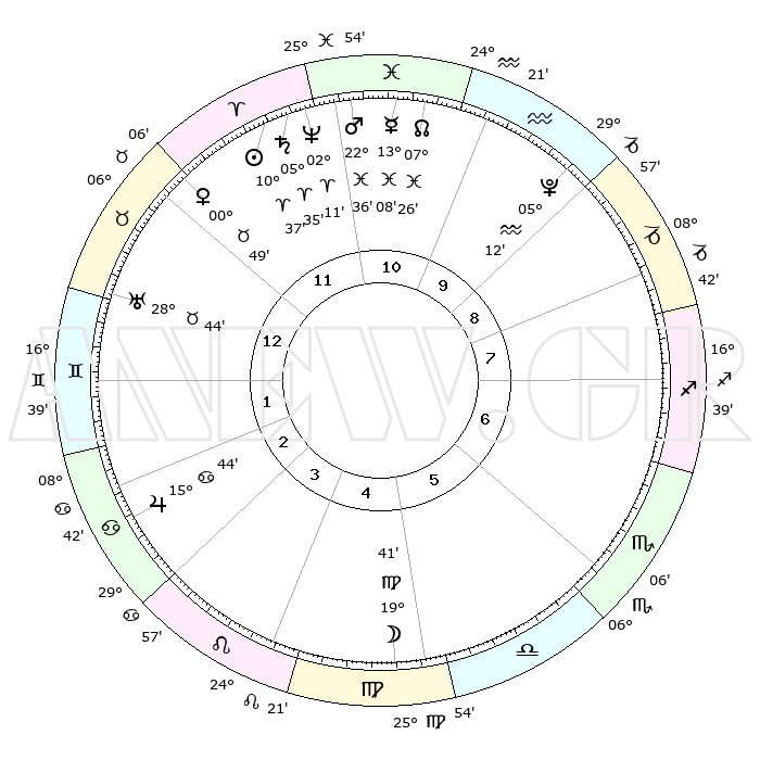 | | ΘΕΣΕΙΣ ΠΛΑΝΗΤΩΝ ΑΣΤΡΟΛΟΓΙΚΟΥ ΧΑΡΤΗ ΤΗΣ ΣΤΙΓΜΗΣ ΑΥΤΗΣ | | | | Πλανήτης | Ζώδιο | Μοίρες | Δεκαήμ. | Σε οίκο | Απόκλιση | | Ακμές των οίκων | | Ηλιος | Κριός | 10°33' | Δεύτερο | 12 | 04 N 11 | | 1ος | 22°36' | Ταύρος | | Σελήνη | Παρθένος | 18°55' | Δεύτερο | 5 | 03 N 32 | | 2ος | 19°00' | Δίδυμοι | | Ερμής | Ιχθείς | 13°06' | Δεύτερο | 11 | 07 S 44 | | 3ος | 10°46' | Καρκίνος | | Αφροδίτη | Ταύρος | 00°44' | Πρώτο | 12 | 11 N 17 | | 4ος | 03°03' | Λέων | | Αρης | Ιχθείς | 22°33' | Τρίτο | 11 | 03 S 55 | | 5ος | 00°19' | Παρθένος | | Δίας | Καρκίνος | 15°44' | Δεύτερο | 3 | 22 N 52 | | 6ος | 07°29' | Ζυγός | | Κρόνος | Κριός | 05°34' | Πρώτο | 11 | 00 N 15 | | 7ος | 22°36' | Σκορπιός | | Ουρανός | Ταύρος | 28°44' | Τρίτο | 1 | 19 N 42 | | 8ος | 19°00' | Τοξότης | | Ποσειδώνας | Κριός | 02°11' | Πρώτο | 11 | 00 S 20 | | 9ος | 10°46' | Αιγόκερως | | Πλούτωνας | Υδροχόος | 05°12' | Πρώτο | 10 | 22 S 47 | | 10ος | 03°03' | Υδροχόος | | Β. Δεσμός | Ιχθείς | 07°27' | Πρώτο | 11 | 08 S 47 | | 11ος | 00°19' | Ιχθείς | | Ωροσκόπος | Ταύρος | 22°36' | Τρίτο | | | 12ος | 07°29' | Κριός | | Μεσουράνημα | Υδροχόος | 03°03' | Πρώτο | | | |
