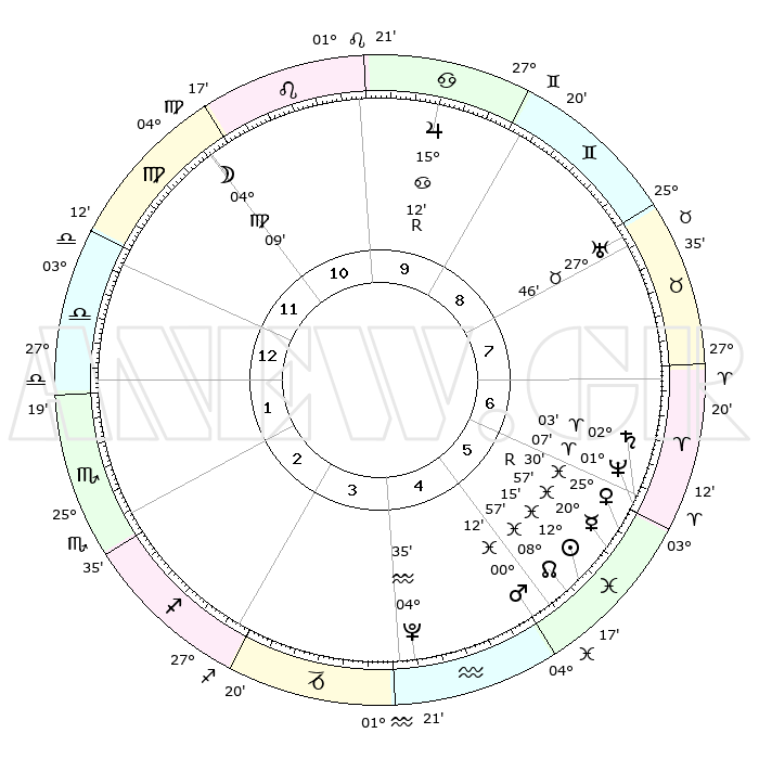 | | ΘΕΣΕΙΣ ΠΛΑΝΗΤΩΝ ΑΣΤΡΟΛΟΓΙΚΟΥ ΧΑΡΤΗ ΤΗΣ ΣΤΙΓΜΗΣ ΑΥΤΗΣ | | | | Πλανήτης | Ζώδιο | Μοίρες | Δεκαήμ. | Σε οίκο | Απόκλιση | | Ακμές των οίκων | | Ηλιος | Ιχθείς | 12°11' | Δεύτερο | 6 | 07 S 00 | | 1ος | 06°08' | Ζυγός | | Σελήνη | Παρθένος | 03°11' | Πρώτο | 11 | 10 N 50 | | 2ος | 03°09' | Σκορπιός | | Ερμής | Ιχθείς | 21°00'R | Τρίτο | 6 | 00 S 19 | | 3ος | 03°49' | Τοξότης | | Αφροδίτη | Ιχθείς | 25°25' | Τρίτο | 6 | 03 S 03 | | 4ος | 06°54' | Αιγόκερως | | Αρης | Ιχθείς | 00°08' | Πρώτο | 5 | 12 S 27 | | 5ος | 09°50' | Υδροχόος | | Δίας | Καρκίνος | 15°12'R | Δεύτερο | 10 | 22 N 55 | | 6ος | 10°01' | Ιχθείς | | Κρόνος | Κριός | 02°03' | Πρώτο | 6 | 01 S 08 | | 7ος | 06°08' | Κριός | | Ουρανός | Ταύρος | 27°46' | Τρίτο | 8 | 19 N 29 | | 8ος | 03°09' | Ταύρος | | Ποσειδώνας | Κριός | 01°07' | Πρώτο | 6 | 00 S 45 | | 9ος | 03°49' | Δίδυμοι | | Πλούτωνας | Υδροχόος | 04°35' | Πρώτο | 4 | 22 S 52 | | 10ος | 06°54' | Καρκίνος | | Β. Δεσμός | Ιχθείς | 08°57' | Πρώτο | 5 | 08 S 13 | | 11ος | 09°50' | Λέων | | Ωροσκόπος | Ζυγός | 06°08' | Πρώτο | | | 12ος | 10°01' | Παρθένος | | Μεσουράνημα | Καρκίνος | 06°54' | Πρώτο | | | |