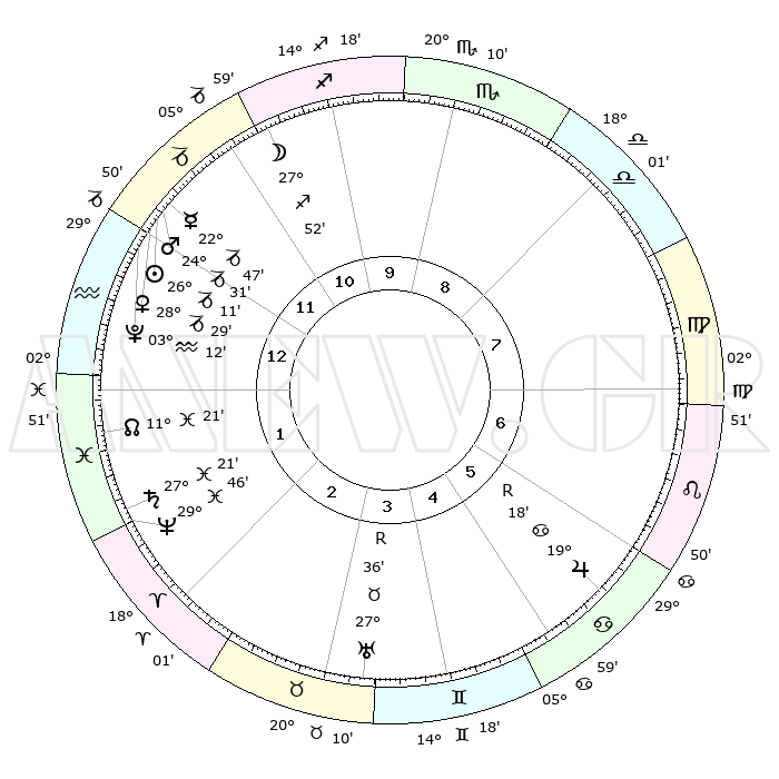 | | ΘΕΣΕΙΣ ΠΛΑΝΗΤΩΝ ΑΣΤΡΟΛΟΓΙΚΟΥ ΧΑΡΤΗ ΤΗΣ ΣΤΙΓΜΗΣ ΑΥΤΗΣ | | | | Πλανήτης | Ζώδιο | Μοίρες | Δεκαήμ. | Σε οίκο | Απόκλιση | | Ακμές των οίκων | | Ηλιος | Αιγόκερως | 26°07' | Τρίτο | 12 | 20 S 55 | | 1ος | 00°58' | Υδροχόος | | Σελήνη | Τοξότης | 27°05' | Τρίτο | 11 | 28 S 18 | | 2ος | 15°14' | Ιχθείς | | Ερμής | Αιγόκερως | 22°41' | Τρίτο | 12 | 23 S 21 | | 3ος | 23°31' | Κριός | | Αφροδίτη | Αιγόκερως | 28°24' | Τρίτο | 12 | 21 S 28 | | 4ος | 21°49' | Ταύρος | | Αρης | Αιγόκερως | 24°28' | Τρίτο | 12 | 22 S 11 | | 5ος | 14°31' | Δίδυμοι | | Δίας | Καρκίνος | 19°19'R | Δεύτερο | 6 | 22 N 19 | | 6ος | 05°58' | Καρκίνος | | Κρόνος | Ιχθείς | 27°21' | Τρίτο | 2 | 03 S 05 | | 7ος | 00°58' | Λέων | | Ουρανός | Ταύρος | 27°37'R | Τρίτο | 4 | 19 N 26 | | 8ος | 15°14' | Παρθένος | | Ποσειδώνας | Ιχθείς | 29°46' | Τρίτο | 2 | 01 S 19 | | 9ος | 23°31' | Ζυγός | | Πλούτωνας | Υδροχόος | 03°12' | Πρώτο | 1 | 23 S 07 | | 10ος | 21°49' | Σκορπιός | | Β. Δεσμός | Ιχθείς | 11°22' | Δεύτερο | 1 | 07 S 18 | | 11ος | 14°31' | Τοξότης | | Ωροσκόπος | Υδροχόος | 00°58' | Πρώτο | | | 12ος | 05°58' | Αιγόκερως | | Μεσουράνημα | Σκορπιός | 21°49' | Τρίτο | | | |