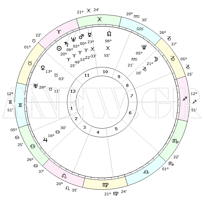 | | ΘΕΣΕΙΣ ΠΛΑΝΗΤΩΝ ΑΣΤΡΟΛΟΓΙΚΟΥ ΧΑΡΤΗ ΤΗΣ ΣΤΙΓΜΗΣ ΑΥΤΗΣ | | | | Πλανήτης | Ζώδιο | Μοίρες | Δεκαήμ. | Σε οίκο | Απόκλιση | | Ακμές των οίκων | | Ηλιος | Κριός | 20°21' | Τρίτο | 12 | 07 N 57 | | 1ος | 09°01' | Ταύρος | | Σελήνη | Αιγόκερως | 20°20' | Τρίτο | 9 | 25 S 41 | | 2ος | 08°48' | Δίδυμοι | | Ερμής | Ιχθείς | 23°27' | Τρίτο | 12 | 04 S 45 | | 3ος | 01°30' | Καρκίνος | | Αφροδίτη | Ταύρος | 12°57' | Δεύτερο | 1 | 15 N 41 | | 4ος | 23°18' | Καρκίνος | | Αρης | Κριός | 00°19' | Πρώτο | 12 | 00 S 48 | | 5ος | 18°42' | Λέων | | Δίας | Καρκίνος | 16°30' | Δεύτερο | 3 | 22 N 47 | | 6ος | 23°13' | Παρθένος | | Κρόνος | Κριός | 06°48' | Πρώτο | 12 | 00 N 44 | | 7ος | 09°01' | Σκορπιός | | Ουρανός | Ταύρος | 29°11' | Τρίτο | 1 | 19 N 48 | | 8ος | 08°48' | Τοξότης | | Ποσειδώνας | Κριός | 02°33' | Πρώτο | 12 | 00 S 11 | | 9ος | 01°30' | Αιγόκερως | | Πλούτωνας | Υδροχόος | 05°21' | Πρώτο | 10 | 22 S 47 | | 10ος | 23°18' | Αιγόκερως | | Β. Δεσμός | Ιχθείς | 06°55' | Πρώτο | 11 | 08 S 58 | | 11ος | 18°42' | Υδροχόος | | Ωροσκόπος | Ταύρος | 09°01' | Πρώτο | | | 12ος | 23°13' | Ιχθείς | | Μεσουράνημα | Αιγόκερως | 23°18' | Τρίτο | | | |