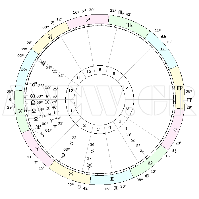 | | ΘΕΣΕΙΣ ΠΛΑΝΗΤΩΝ ΑΣΤΡΟΛΟΓΙΚΟΥ ΧΑΡΤΗ ΤΗΣ ΣΤΙΓΜΗΣ ΑΥΤΗΣ | | | | Πλανήτης | Ζώδιο | Μοίρες | Δεκαήμ. | Σε οίκο | Απόκλιση | | Ακμές των οίκων | | Ηλιος | Ιχθείς | 03°31' | Πρώτο | 1 | 10 S 13 | | 1ος | 29°56' | Αιγόκερως | | Σελήνη | Ταύρος | 02°20' | Πρώτο | 3 | 16 N 16 | | 2ος | 14°01' | Ιχθείς | | Ερμής | Ιχθείς | 21°11' | Τρίτο | 2 | 01 S 51 | | 3ος | 22°29' | Κριός | | Αφροδίτη | Ιχθείς | 14°40' | Δεύτερο | 2 | 07 S 22 | | 4ος | 20°57' | Ταύρος | | Αρης | Υδροχόος | 23°21' | Τρίτο | 1 | 14 S 46 | | 5ος | 13°43' | Δίδυμοι | | Δίας | Καρκίνος | 15°33'R | Δεύτερο | 6 | 22 N 52 | | 6ος | 05°08' | Καρκίνος | | Κρόνος | Κριός | 01°02' | Πρώτο | 2 | 01 S 33 | | 7ος | 29°56' | Καρκίνος | | Ουρανός | Ταύρος | 27°36' | Τρίτο | 4 | 19 N 27 | | 8ος | 14°01' | Παρθένος | | Ποσειδώνας | Κριός | 00°48' | Πρώτο | 2 | 00 S 53 | | 9ος | 22°29' | Ζυγός | | Πλούτωνας | Υδροχόος | 04°21' | Πρώτο | 1 | 22 S 54 | | 10ος | 20°57' | Σκορπιός | | Β. Δεσμός | Ιχθείς | 09°24' | Πρώτο | 1 | 08 S 02 | | 11ος | 13°43' | Τοξότης | | Ωροσκόπος | Αιγόκερως | 29°56' | Τρίτο | | | 12ος | 05°08' | Αιγόκερως | | Μεσουράνημα | Σκορπιός | 20°57' | Τρίτο | | | |