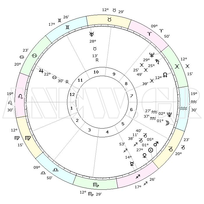 | | ΘΕΣΕΙΣ ΠΛΑΝΗΤΩΝ ΑΣΤΡΟΛΟΓΙΚΟΥ ΧΑΡΤΗ ΤΗΣ ΣΤΙΓΜΗΣ ΑΥΤΗΣ | | | | Πλανήτης | Ζώδιο | Μοίρες | Δεκαήμ. | Σε οίκο | Απόκλιση | | Ακμές των οίκων | | Ηλιος | Αιγόκερως | 01°07' | Πρώτο | 6 | 23 S 26 | | 1ος | 28°44' | Καρκίνος | | Σελήνη | Υδροχόος | 00°44' | Πρώτο | 7 | 23 S 12 | | 2ος | 19°42' | Λέων | | Ερμής | Τοξότης | 14°47' | Δεύτερο | 5 | 22 S 01 | | 3ος | 14°34' | Παρθένος | | Αφροδίτη | Τοξότης | 27°32' | Τρίτο | 6 | 23 S 33 | | 4ος | 15°27' | Ζυγός | | Αρης | Αιγόκερως | 05°37' | Πρώτο | 6 | 24 S 09 | | 5ος | 21°31' | Σκορπιός | | Δίας | Καρκίνος | 22°31'R | Τρίτο | 12 | 21 N 46 | | 6ος | 27°26' | Τοξότης | | Κρόνος | Ιχθείς | 25°49' | Τρίτο | 9 | 03 S 46 | | 7ος | 28°44' | Αιγόκερως | | Ουρανός | Ταύρος | 28°14'R | Τρίτο | 11 | 19 N 34 | | 8ος | 19°42' | Υδροχόος | | Ποσειδώνας | Ιχθείς | 29°25' | Τρίτο | 9 | 01 S 28 | | 9ος | 14°34' | Ιχθείς | | Πλούτωνας | Υδροχόος | 02°27' | Πρώτο | 7 | 23 S 17 | | 10ος | 15°27' | Κριός | | Β. Δεσμός | Ιχθείς | 12°40' | Δεύτερο | 8 | 06 S 48 | | 11ος | 21°31' | Ταύρος | | Ωροσκόπος | Καρκίνος | 28°44' | Τρίτο | | | 12ος | 27°26' | Δίδυμοι | | Μεσουράνημα | Κριός | 15°27' | Δεύτερο | | | |