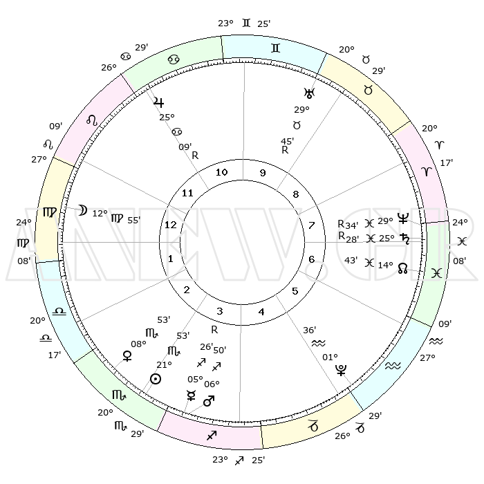 | | ΘΕΣΕΙΣ ΠΛΑΝΗΤΩΝ ΑΣΤΡΟΛΟΓΙΚΟΥ ΧΑΡΤΗ ΤΗΣ ΣΤΙΓΜΗΣ ΑΥΤΗΣ | | | | Πλανήτης | Ζώδιο | Μοίρες | Δεκαήμ. | Σε οίκο | Απόκλιση | | Ακμές των οίκων | | Ηλιος | Σκορπιός | 21°49' | Τρίτο | 3 | 18 S 13 | | 1ος | 03°33' | Παρθένος | | Σελήνη | Παρθένος | 12°02' | Δεύτερο | 1 | 07 N 23 | | 2ος | 27°47' | Παρθένος | | Ερμής | Τοξότης | 05°29'R | Πρώτο | 4 | 22 S 42 | | 3ος | 26°45' | Ζυγός | | Αφροδίτη | Σκορπιός | 08°47' | Πρώτο | 3 | 13 S 15 | | 4ος | 29°42' | Σκορπιός | | Αρης | Τοξότης | 06°47' | Πρώτο | 4 | 21 S 57 | | 5ος | 03°40' | Αιγόκερως | | Δίας | Καρκίνος | 25°09'R | Τρίτο | 11 | 21 N 13 | | 6ος | 05°21' | Υδροχόος | | Κρόνος | Ιχθείς | 25°28'R | Τρίτο | 7 | 04 S 02 | | 7ος | 03°33' | Ιχθείς | | Ουρανός | Ταύρος | 29°45'R | Τρίτο | 10 | 19 N 53 | | 8ος | 27°47' | Ιχθείς | | Ποσειδώνας | Ιχθείς | 29°34'R | Τρίτο | 8 | 01 S 25 | | 9ος | 26°45' | Κριός | | Πλούτωνας | Υδροχόος | 01°36' | Πρώτο | 5 | 23 S 28 | | 10ος | 29°42' | Ταύρος | | Β. Δεσμός | Ιχθείς | 14°43' | Δεύτερο | 7 | 06 S 01 | | 11ος | 03°40' | Καρκίνος | | Ωροσκόπος | Παρθένος | 03°33' | Πρώτο | | | 12ος | 05°21' | Λέων | | Μεσουράνημα | Ταύρος | 29°42' | Τρίτο | | | |