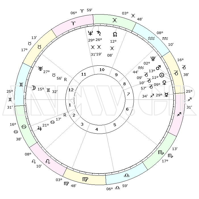 | | ΘΕΣΕΙΣ ΠΛΑΝΗΤΩΝ ΑΣΤΡΟΛΟΓΙΚΟΥ ΧΑΡΤΗ ΤΗΣ ΣΤΙΓΜΗΣ ΑΥΤΗΣ | | | | Πλανήτης | Ζώδιο | Μοίρες | Δεκαήμ. | Σε οίκο | Απόκλιση | | Ακμές των οίκων | | Ηλιος | Αιγόκερως | 11°05' | Δεύτερο | 8 | 22 S 58 | | 1ος | 24°30' | Ταύρος | | Σελήνη | Δίδυμοι | 14°20' | Δεύτερο | 1 | 27 N 32 | | 2ος | 20°29' | Δίδυμοι | | Ερμής | Τοξότης | 29°26' | Τρίτο | 8 | 24 S 03 | | 3ος | 12°08' | Καρκίνος | | Αφροδίτη | Αιγόκερως | 09°51' | Πρώτο | 8 | 23 S 35 | | 4ος | 04°32' | Λέων | | Αρης | Αιγόκερως | 13°05' | Δεύτερο | 9 | 23 S 41 | | 5ος | 02°05' | Παρθένος | | Δίας | Καρκίνος | 21°17'R | Τρίτο | 3 | 21 N 59 | | 6ος | 09°36' | Ζυγός | | Κρόνος | Ιχθείς | 26°19' | Τρίτο | 11 | 03 S 32 | | 7ος | 24°30' | Σκορπιός | | Ουρανός | Ταύρος | 27°56'R | Τρίτο | 1 | 19 N 30 | | 8ος | 20°29' | Τοξότης | | Ποσειδώνας | Ιχθείς | 29°31' | Τρίτο | 11 | 01 S 25 | | 9ος | 12°08' | Αιγόκερως | | Πλούτωνας | Υδροχόος | 02°44' | Πρώτο | 9 | 23 S 13 | | 10ος | 04°32' | Υδροχόος | | Β. Δεσμός | Ιχθείς | 12°09' | Δεύτερο | 11 | 07 S 00 | | 11ος | 02°05' | Ιχθείς | | Ωροσκόπος | Ταύρος | 24°30' | Τρίτο | | | 12ος | 09°36' | Κριός | | Μεσουράνημα | Υδροχόος | 04°32' | Πρώτο | | | |