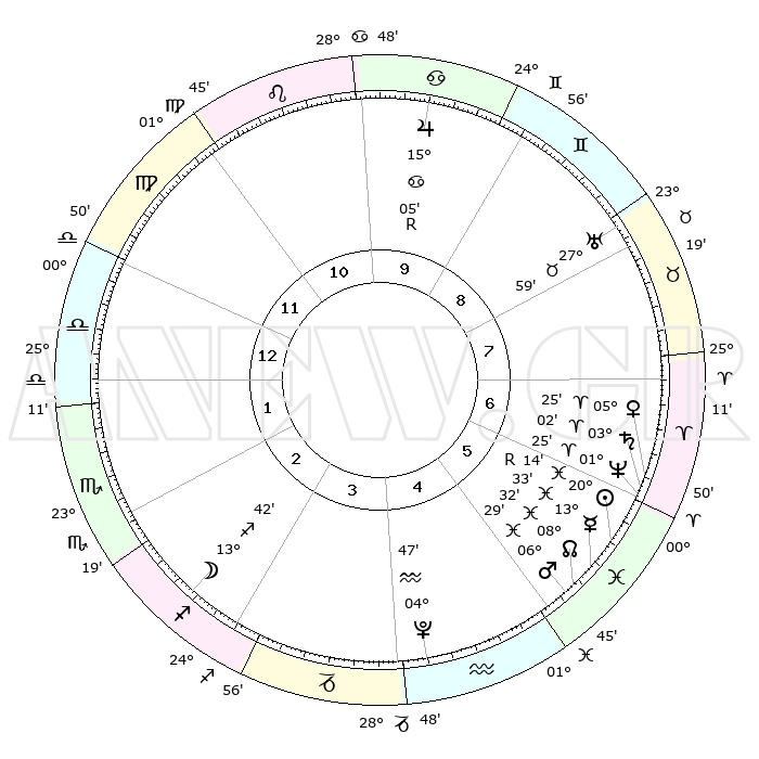 | | ΘΕΣΕΙΣ ΠΛΑΝΗΤΩΝ ΑΣΤΡΟΛΟΓΙΚΟΥ ΧΑΡΤΗ ΤΗΣ ΣΤΙΓΜΗΣ ΑΥΤΗΣ | | | | Πλανήτης | Ζώδιο | Μοίρες | Δεκαήμ. | Σε οίκο | Απόκλιση | | Ακμές των οίκων | | Ηλιος | Ιχθείς | 20°10' | Τρίτο | 6 | 03 S 54 | | 1ος | 07°52' | Ζυγός | | Σελήνη | Τοξότης | 13°00' | Δεύτερο | 3 | 27 S 34 | | 2ος | 04°59' | Σκορπιός | | Ερμής | Ιχθείς | 13°36'R | Δεύτερο | 6 | 03 S 25 | | 3ος | 05°43' | Τοξότης | | Αφροδίτη | Κριός | 05°21' | Πρώτο | 6 | 01 N 03 | | 4ος | 08°51' | Αιγόκερως | | Αρης | Ιχθείς | 06°26' | Πρώτο | 5 | 10 S 10 | | 5ος | 11°47' | Υδροχόος | | Δίας | Καρκίνος | 15°05'R | Δεύτερο | 10 | 22 N 56 | | 6ος | 11°53' | Ιχθείς | | Κρόνος | Κριός | 03°01' | Πρώτο | 6 | 00 S 45 | | 7ος | 07°52' | Κριός | | Ουρανός | Ταύρος | 27°59' | Τρίτο | 8 | 19 N 32 | | 8ος | 04°59' | Ταύρος | | Ποσειδώνας | Κριός | 01°24' | Πρώτο | 6 | 00 S 38 | | 9ος | 05°43' | Δίδυμοι | | Πλούτωνας | Υδροχόος | 04°47' | Πρώτο | 4 | 22 S 50 | | 10ος | 08°51' | Καρκίνος | | Β. Δεσμός | Ιχθείς | 08°32' | Πρώτο | 5 | 08 S 22 | | 11ος | 11°47' | Λέων | | Ωροσκόπος | Ζυγός | 07°52' | Πρώτο | | | 12ος | 11°53' | Παρθένος | | Μεσουράνημα | Καρκίνος | 08°51' | Πρώτο | | | |