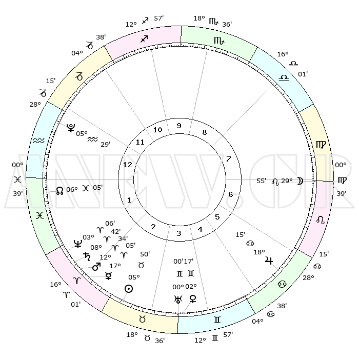 | | ΘΕΣΕΙΣ ΠΛΑΝΗΤΩΝ ΑΣΤΡΟΛΟΓΙΚΟΥ ΧΑΡΤΗ ΤΗΣ ΣΤΙΓΜΗΣ ΑΥΤΗΣ | | | | Πλανήτης | Ζώδιο | Μοίρες | Δεκαήμ. | Σε οίκο | Απόκλιση | | Ακμές των οίκων | | Ηλιος | Ταύρος | 05°46' | Πρώτο | 3 | 13 N 26 | | 1ος | 00°08' | Υδροχόος | | Σελήνη | Λέων | 29°05' | Τρίτο | 7 | 12 N 29 | | 2ος | 14°16' | Ιχθείς | | Ερμής | Κριός | 16°58' | Δεύτερο | 2 | 04 N 29 | | 3ος | 22°41' | Κριός | | Αφροδίτη | Δίδυμοι | 02°12' | Πρώτο | 4 | 21 N 15 | | 4ος | 21°08' | Ταύρος | | Αρης | Κριός | 12°31' | Δεύτερο | 2 | 04 N 06 | | 5ος | 13°53' | Δίδυμοι | | Δίας | Καρκίνος | 18°15' | Δεύτερο | 6 | 22 N 34 | | 6ος | 05°18' | Καρκίνος | | Κρόνος | Κριός | 08°41' | Πρώτο | 2 | 01 N 27 | | 7ος | 00°08' | Λέων | | Ουρανός | Δίδυμοι | 00°00' | Πρώτο | 4 | 19 N 59 | | 8ος | 14°16' | Παρθένος | | Ποσειδώνας | Κριός | 03°06' | Πρώτο | 2 | 00 N 01 | | 9ος | 22°41' | Ζυγός | | Πλούτωνας | Υδροχόος | 05°29' | Πρώτο | 1 | 22 S 48 | | 10ος | 21°08' | Σκορπιός | | Β. Δεσμός | Ιχθείς | 06°05' | Πρώτο | 1 | 09 S 17 | | 11ος | 13°53' | Τοξότης | | Ωροσκόπος | Υδροχόος | 00°08' | Πρώτο | | | 12ος | 05°18' | Αιγόκερως | | Μεσουράνημα | Σκορπιός | 21°08' | Τρίτο | | | |